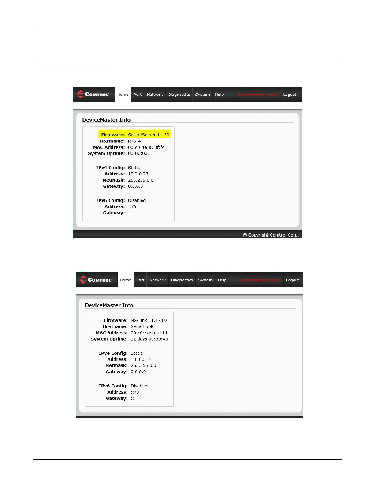 Note: The top illustration shows the web page before an NS-Link device driver installation and the bottom