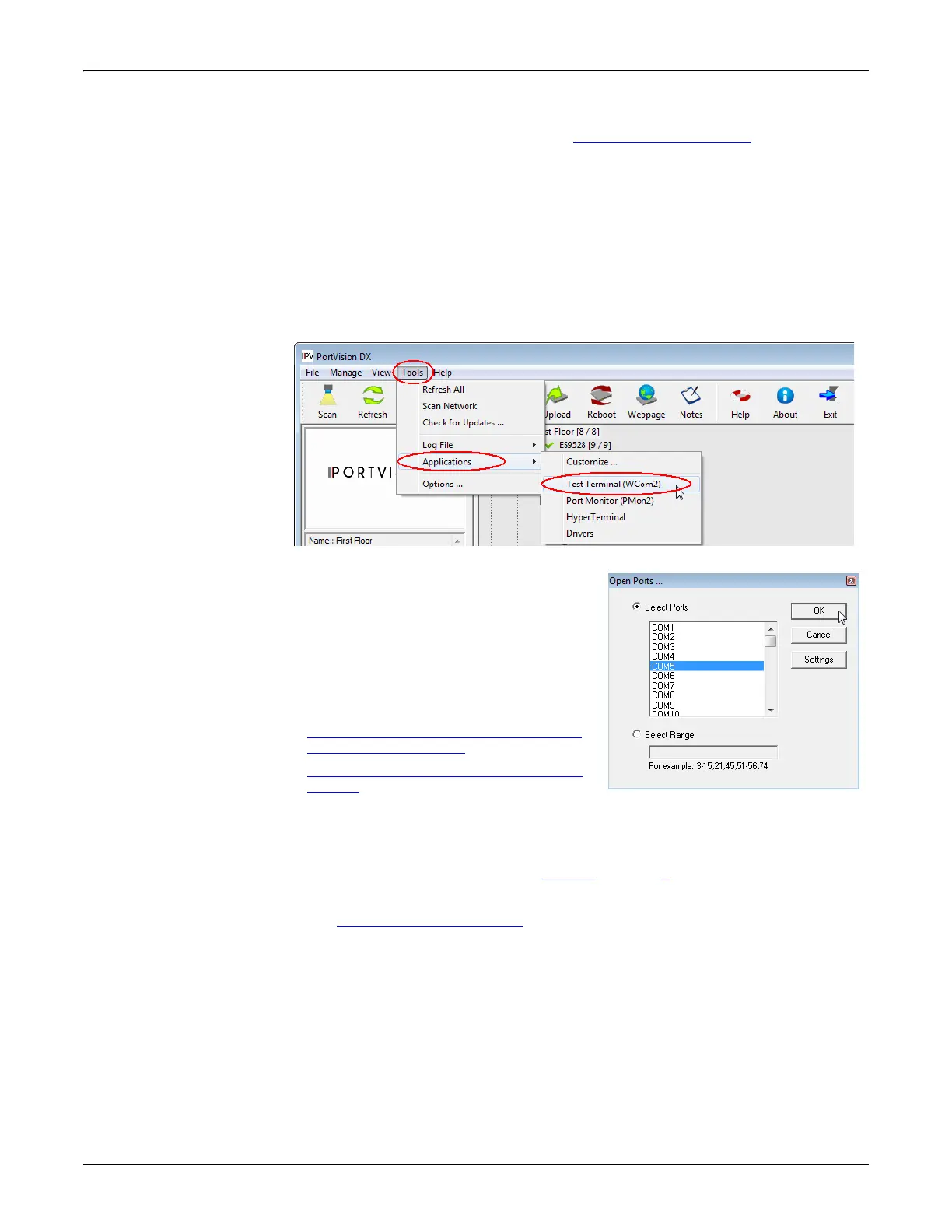 2. Start Test Terminal (WCom2). If necessary, start PortVision DX from the Start