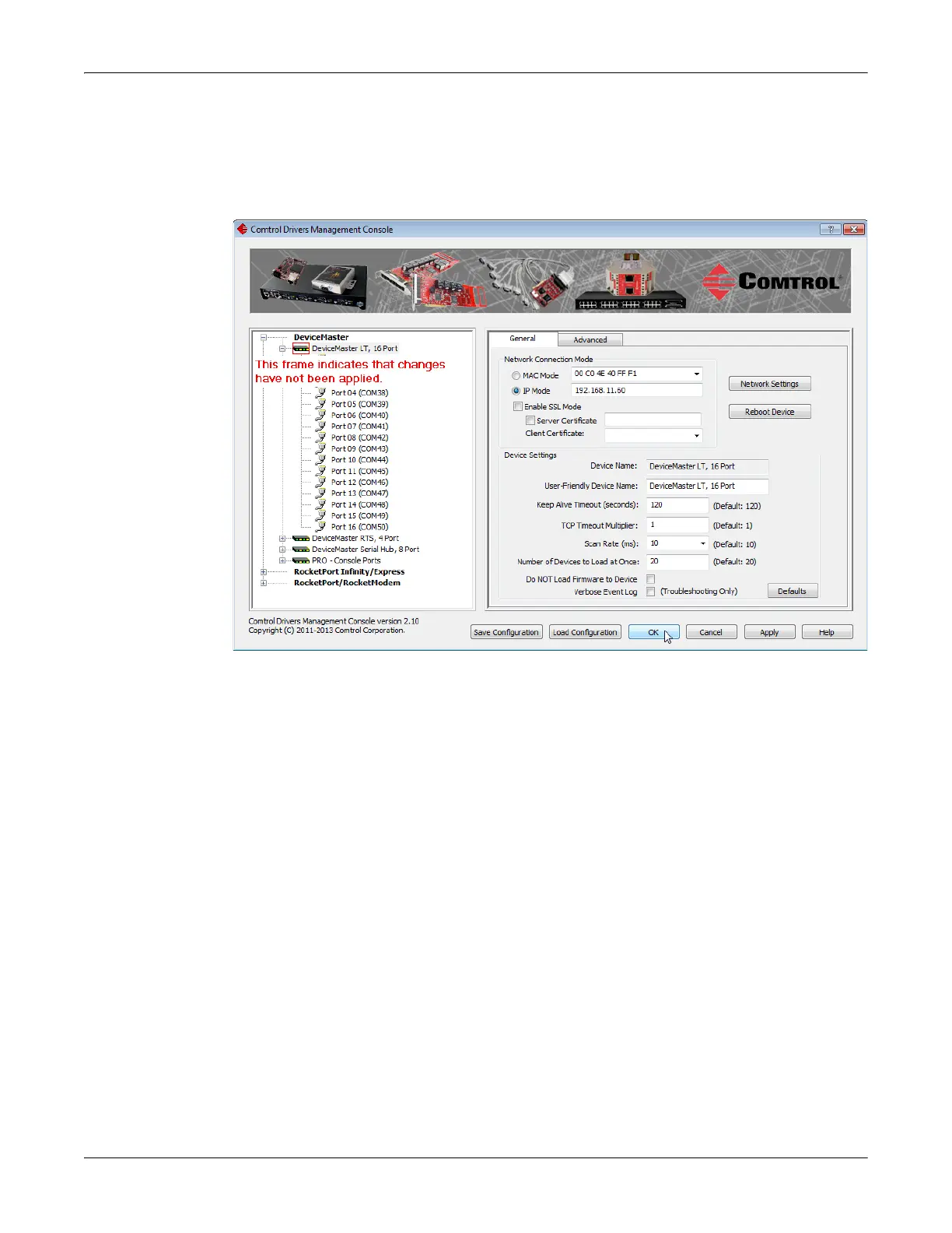 • Reboot the DeviceMaster LT on the General tab
