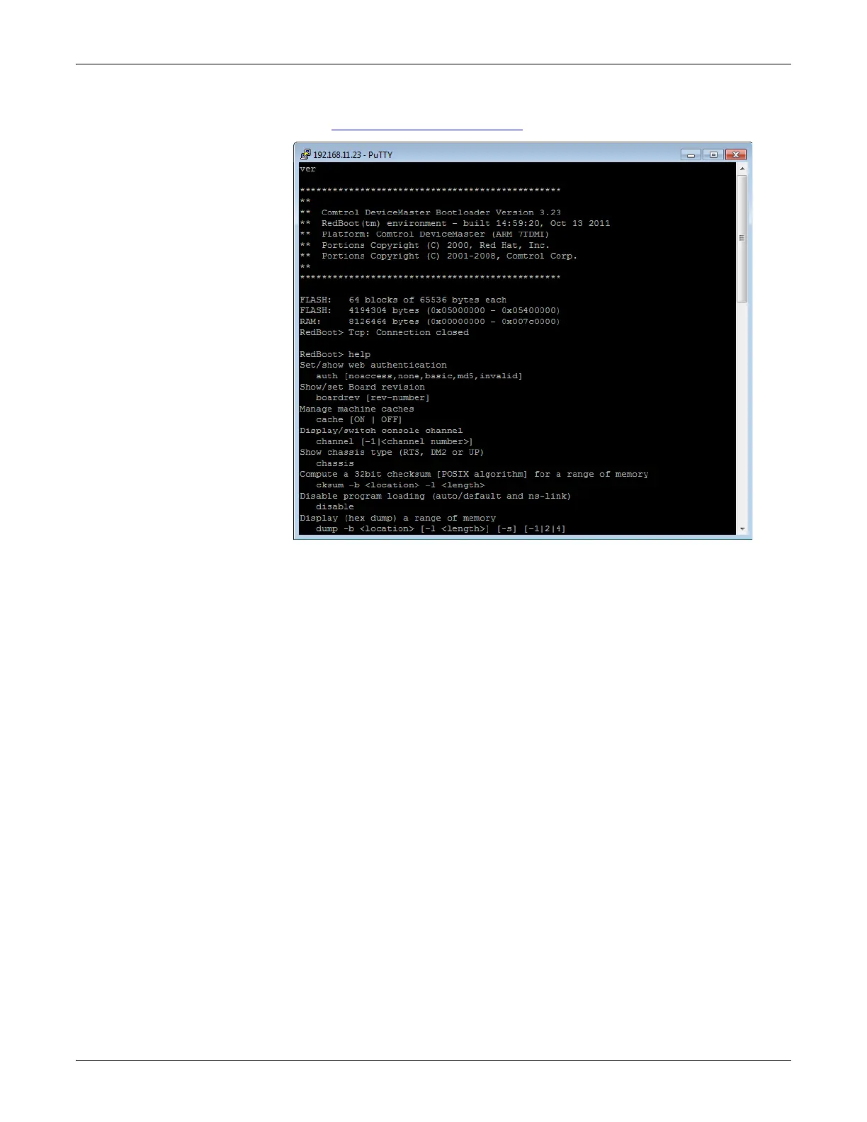 7. Press Enter. You can type help to review the RedBoot commands. You can also
