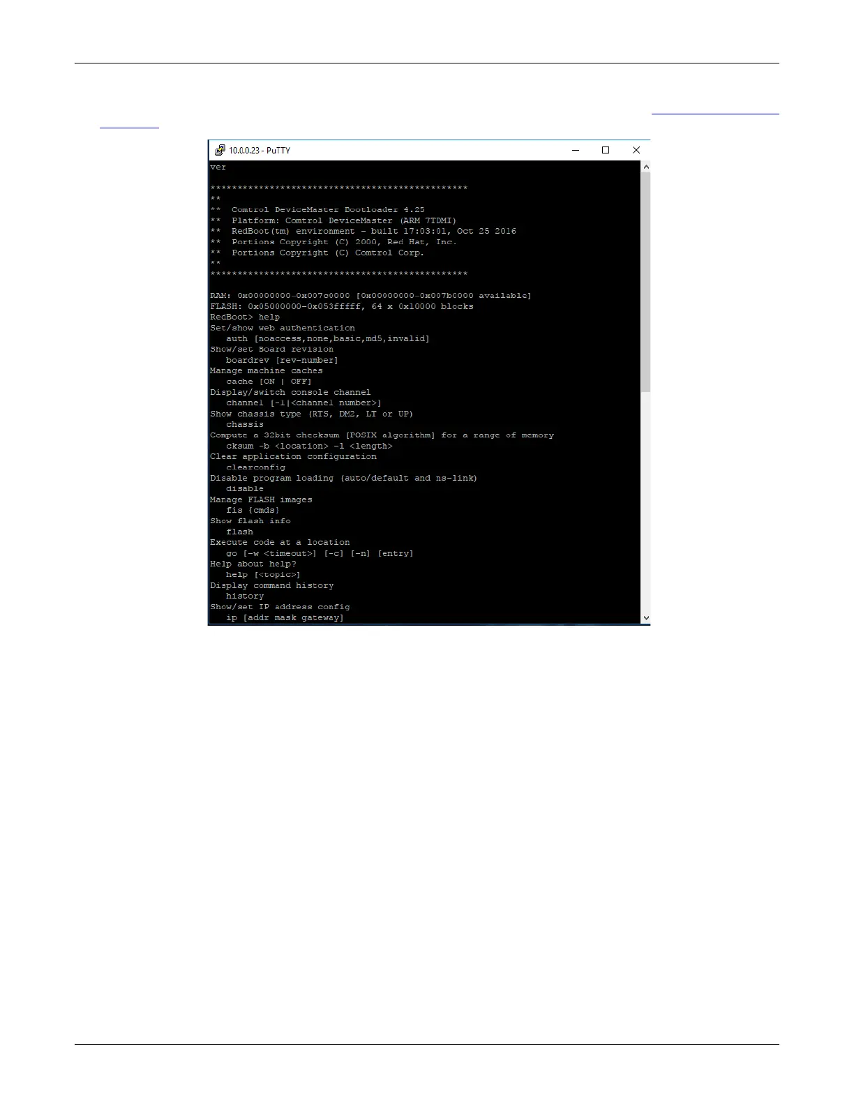 7. Press Enter. You can type help to review the RedBoot commands. You can also refer to RedBoot Command