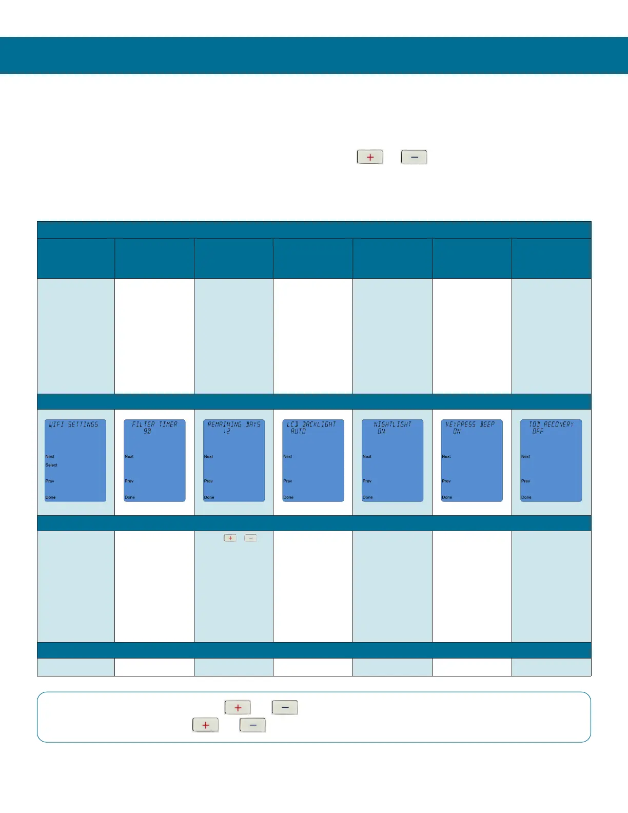 Wi-Fi Settings Filter Timer Reset Filter LCD Backlight Nightlight Keypress Beep TOD Recovery