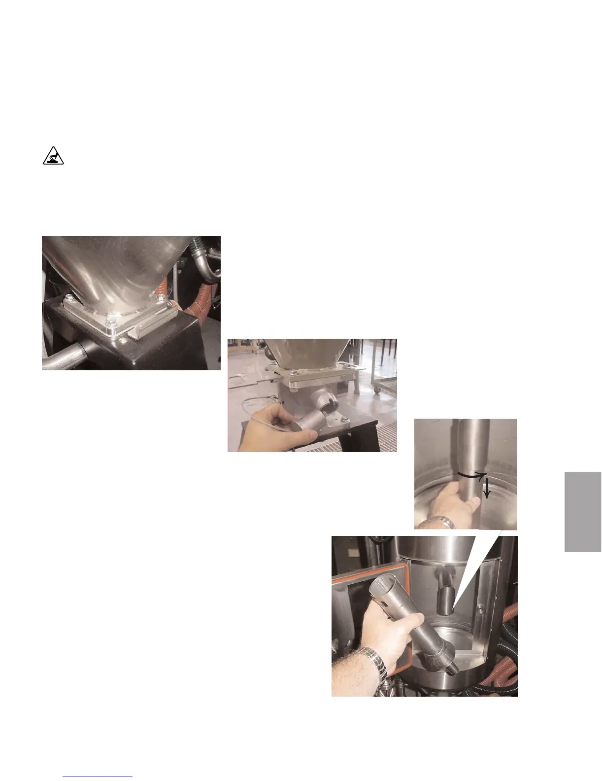 3 Remove the spreader cone. Open the hopper door. Reach into the hopper.