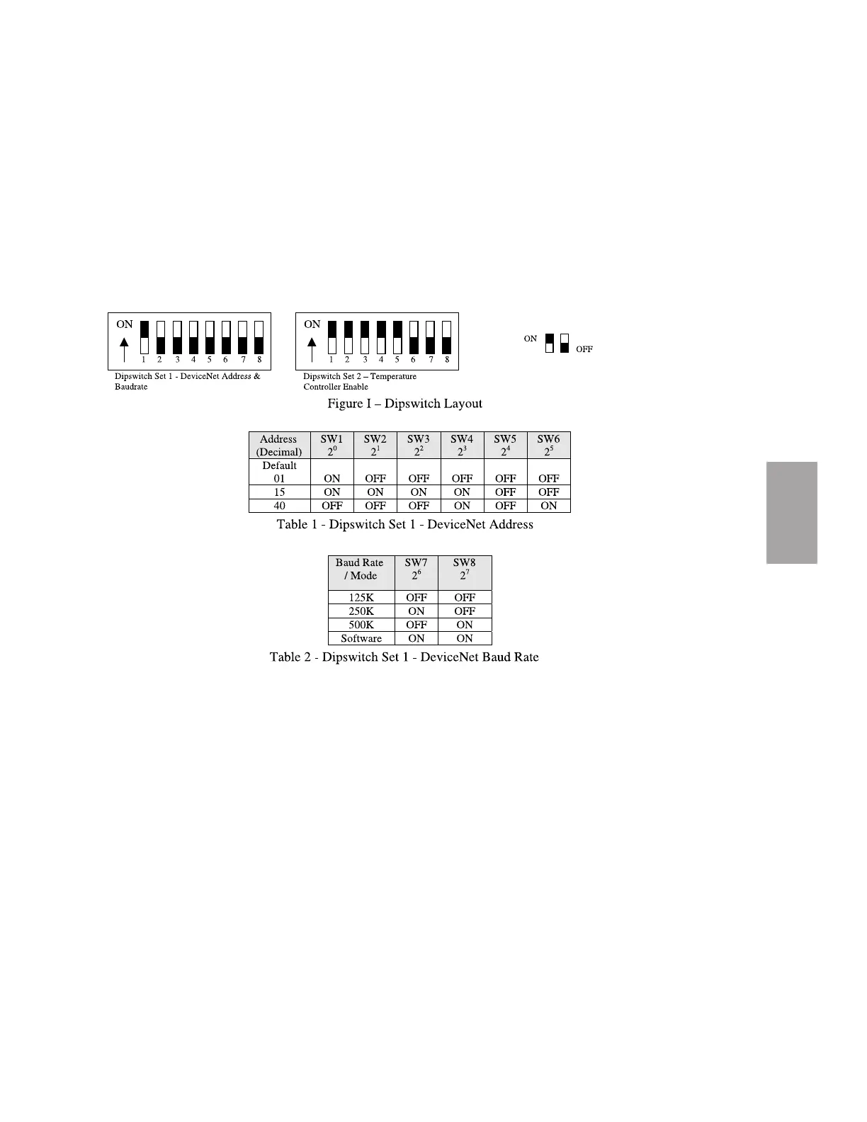 Dip switch 1 provides the DeviceNet MacId address and baud rate using the stan-