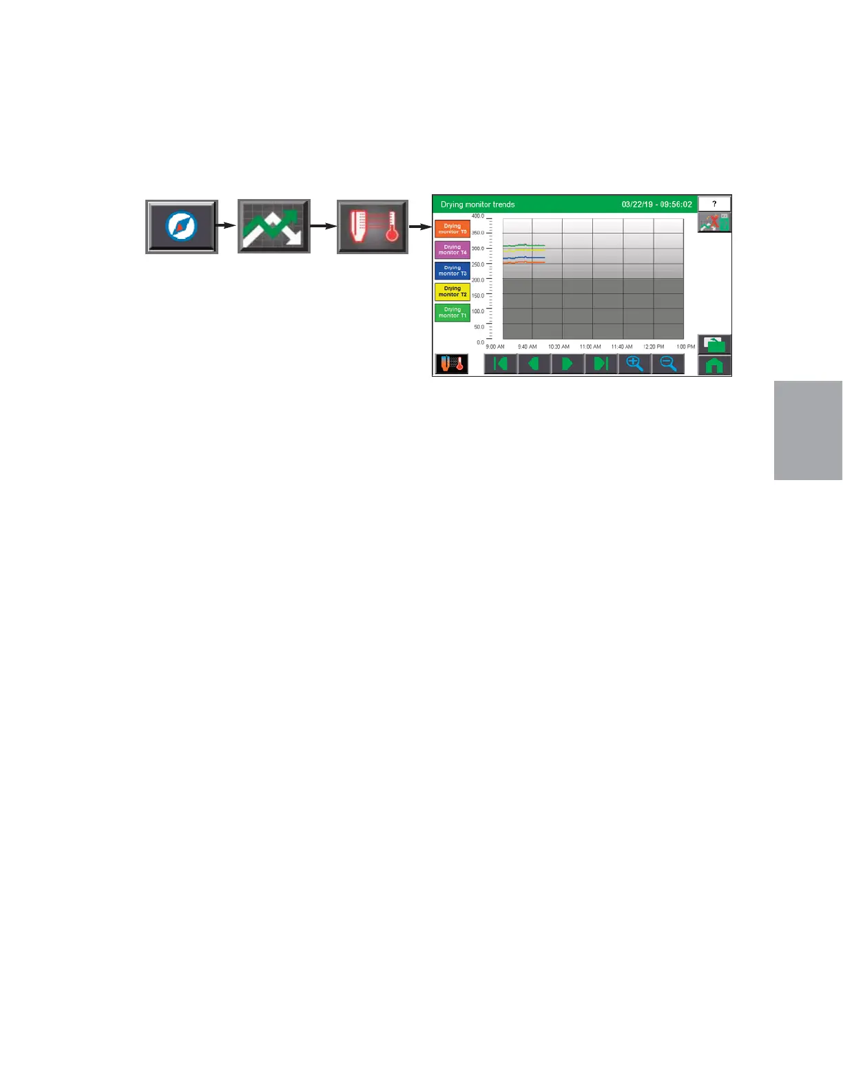 The Hopper Drying Monitor Trending screen allows the user to view the temperatures at