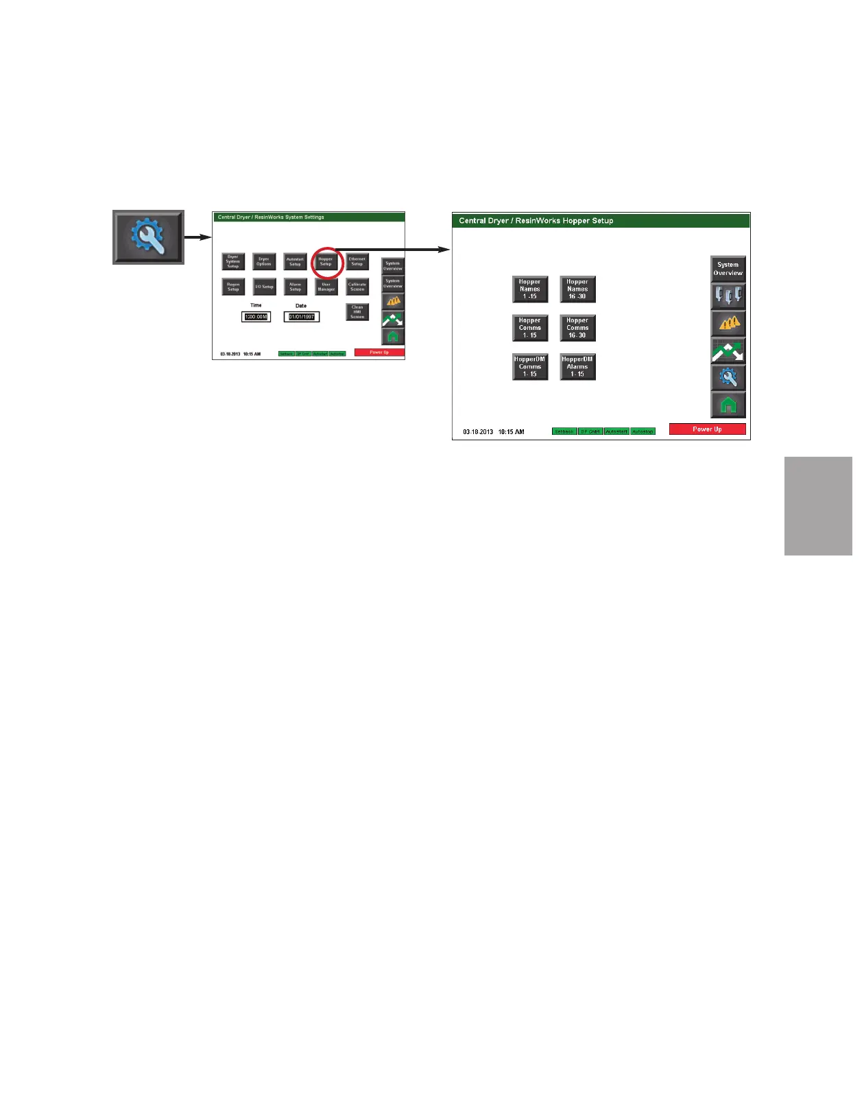 The ResinWorks Hopper Setup screen provides the user with the ability to move to a screen