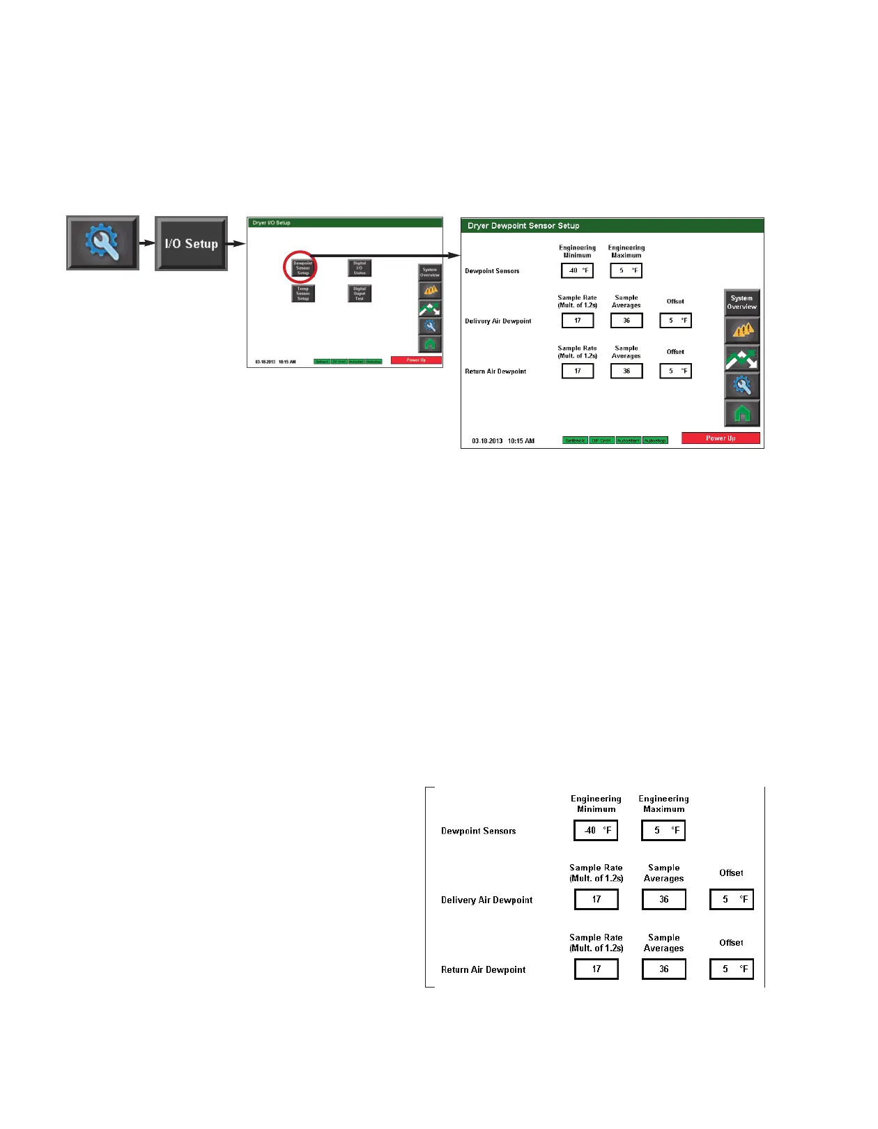 The Dryer Dewpoint Sensor Setup screen provides the user with the ability to adjust the set-