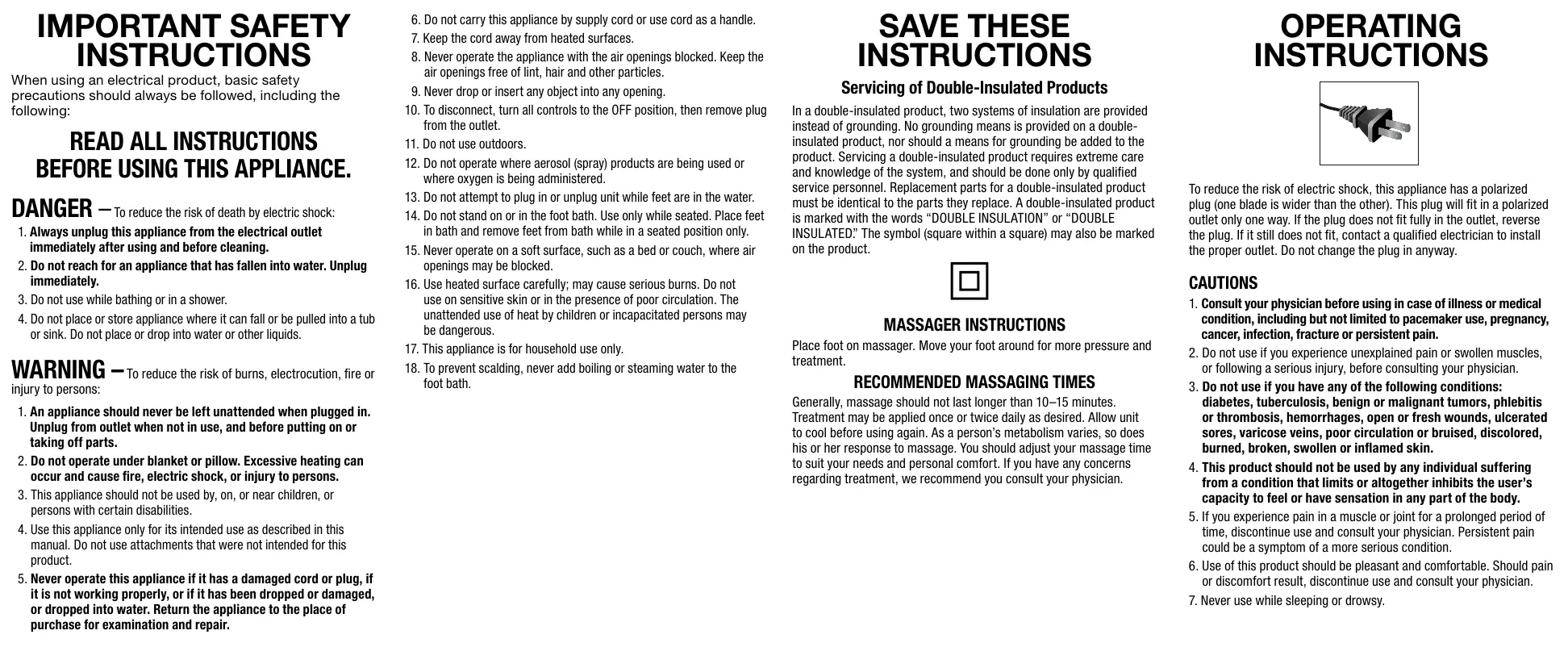 14. Do not stand on or in the foot bath. Use only while seated. Place feet