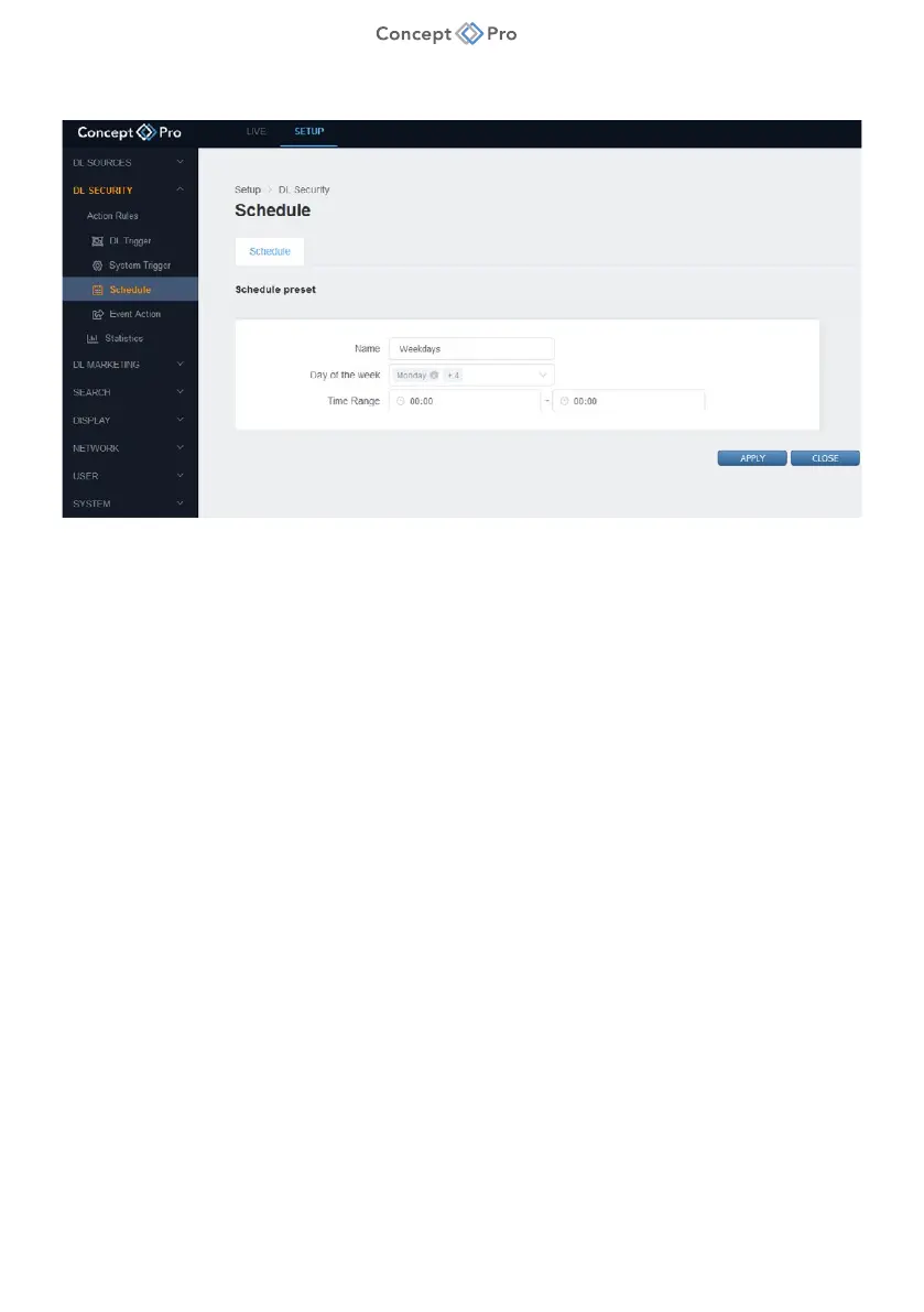 1. From DL PLUS web interface, select <SETUP> tab, then <DL SECURITY> - <SCHEDULE>