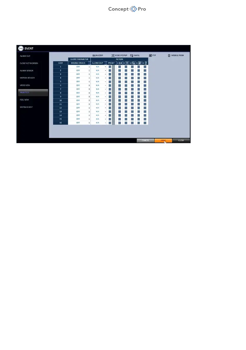 b. ACTION: The following event actions can be configured for any channel configured to use