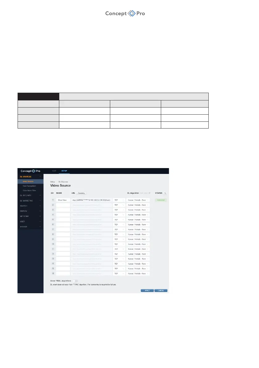 Configure the video sources, channel name, applicable DL algorithm, and object exclusion area