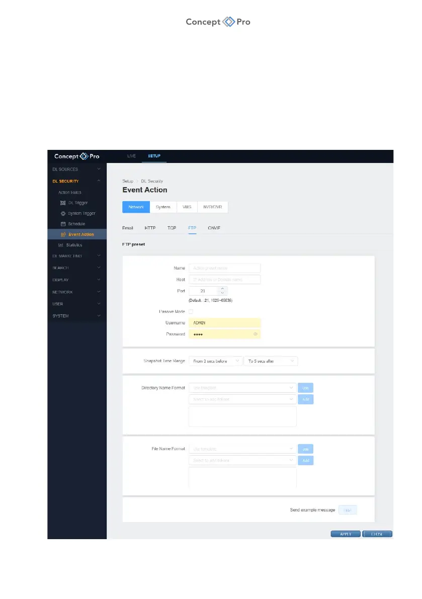 1. From the <SETUP> tab, navigate to <DL SECURITY> - <EVENT ACTION> menu.