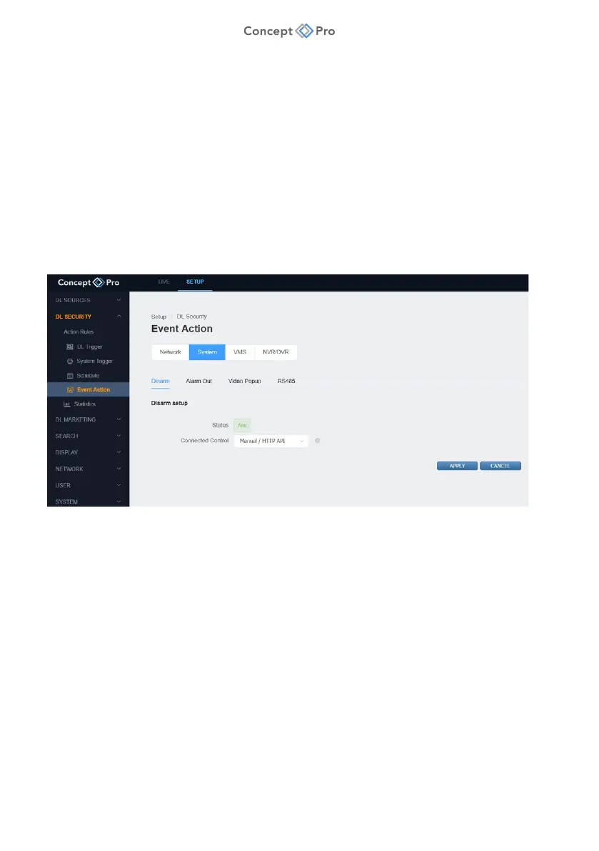 HTTP command, Alarm Input event, or manual disarming via Live view. When the system is in