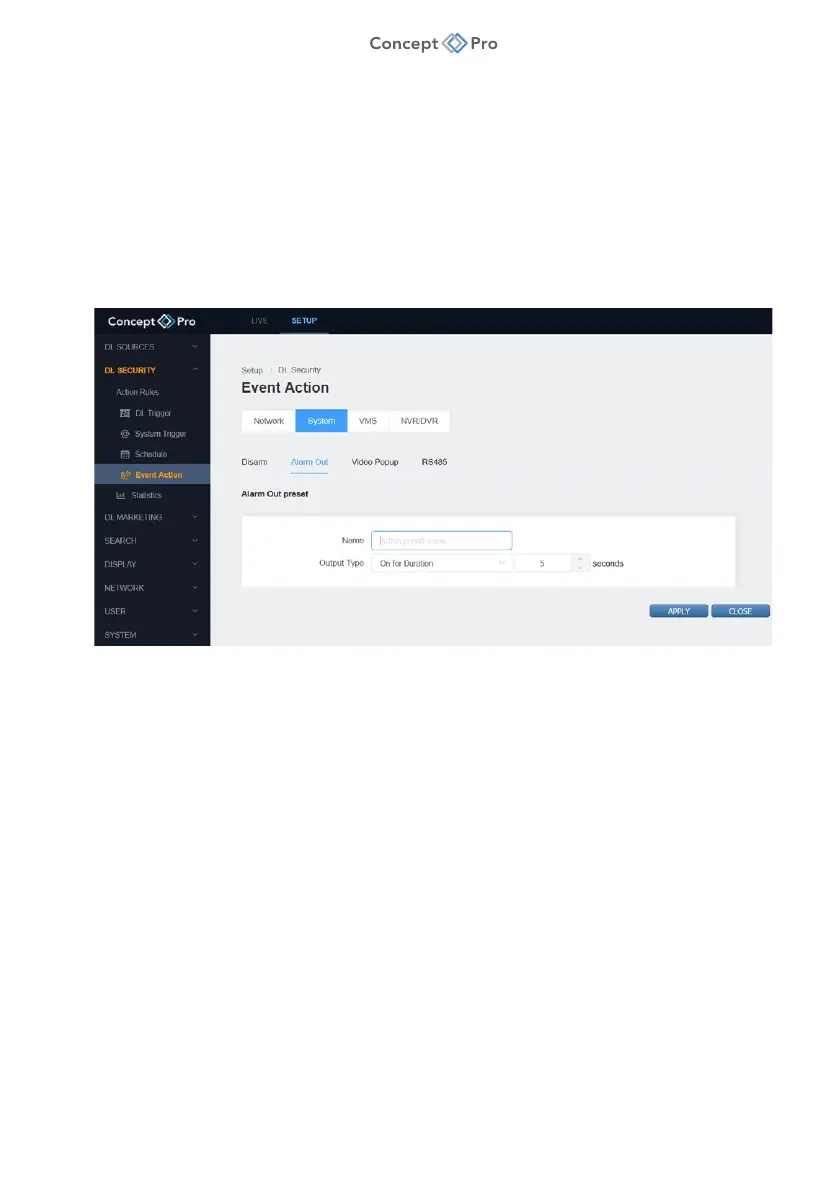 1. From the <SETUP> tab, navigate to <DL SECURITY> - <EVENT ACTION> menu.
