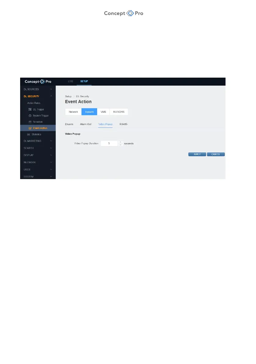A Video Popup system event action opens the video source channel in full screen on the DL
