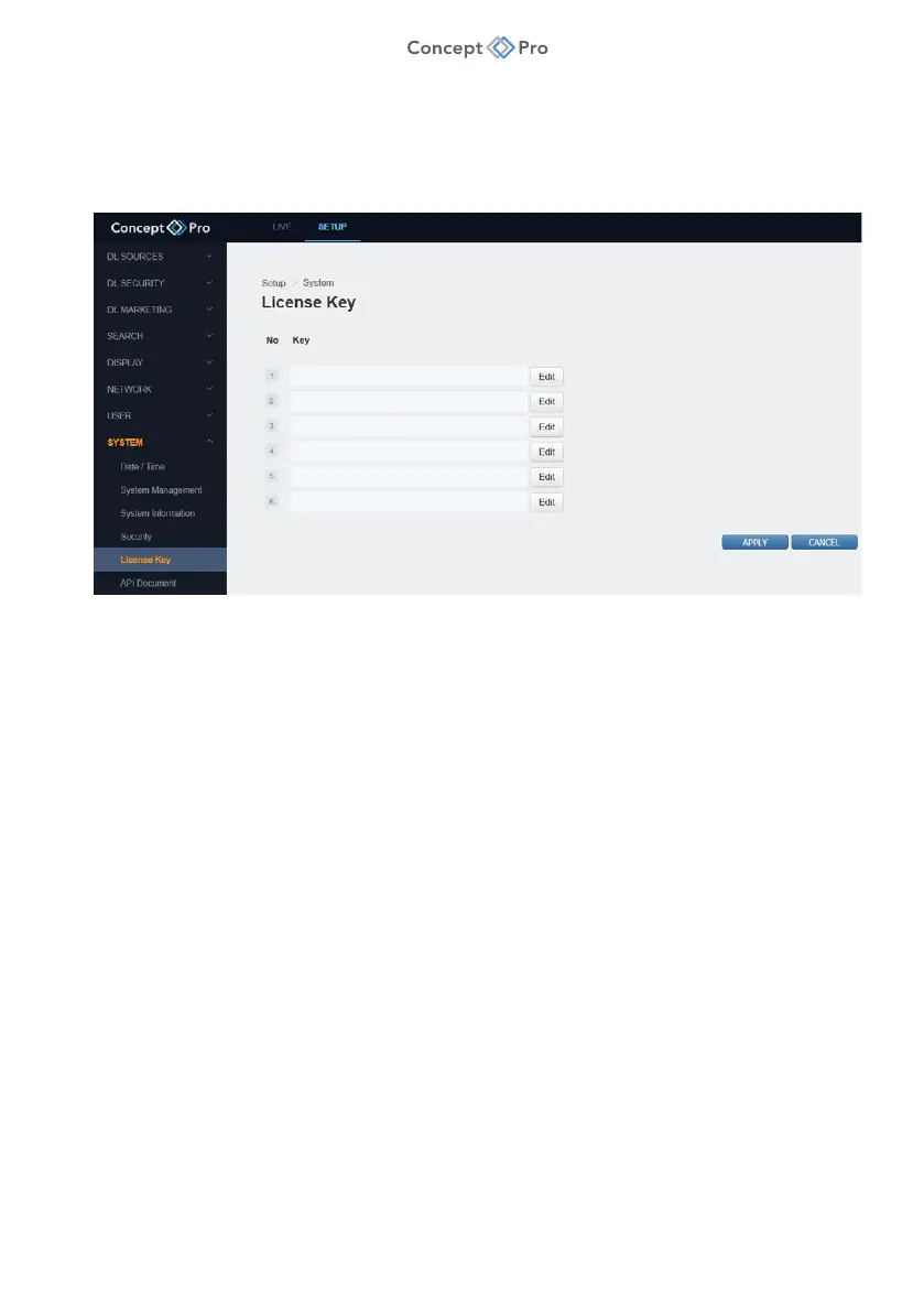 1. From the <SETUP> tab, select <SYSTEM> - <LICENSE KEY> menu.