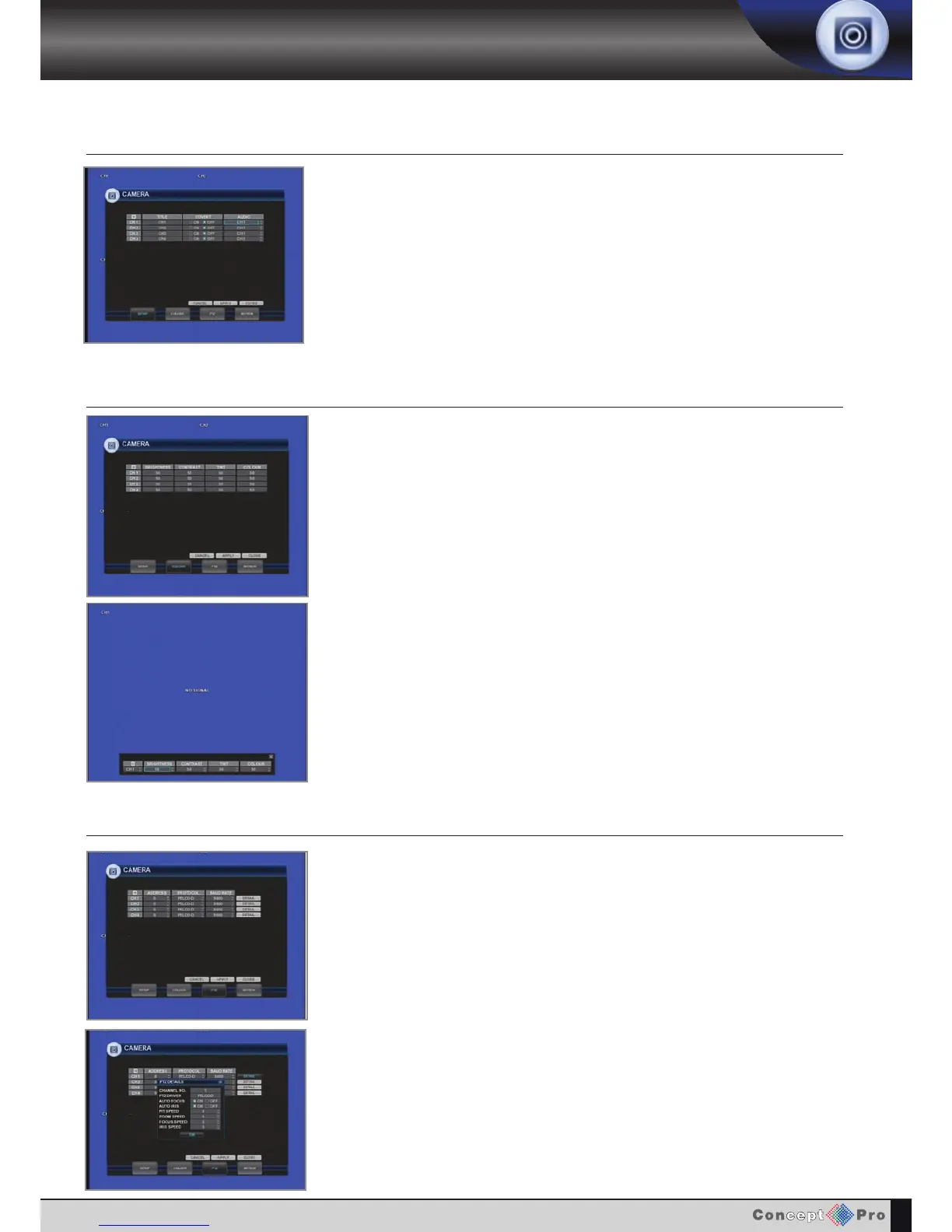 PTZ properties can also be adjusted for each channel by selecting the DETAIL and pressing