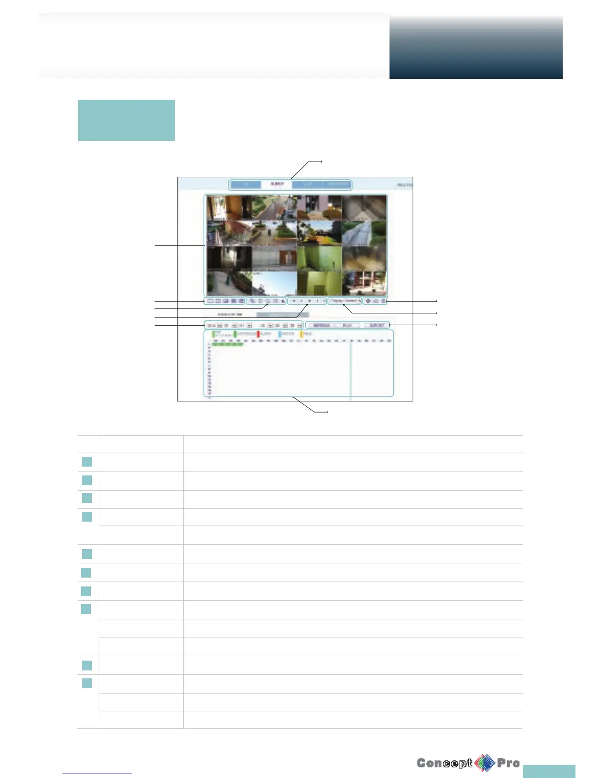 1 View selection tab You can switch to the live, playback and setup screen and check the provided information.