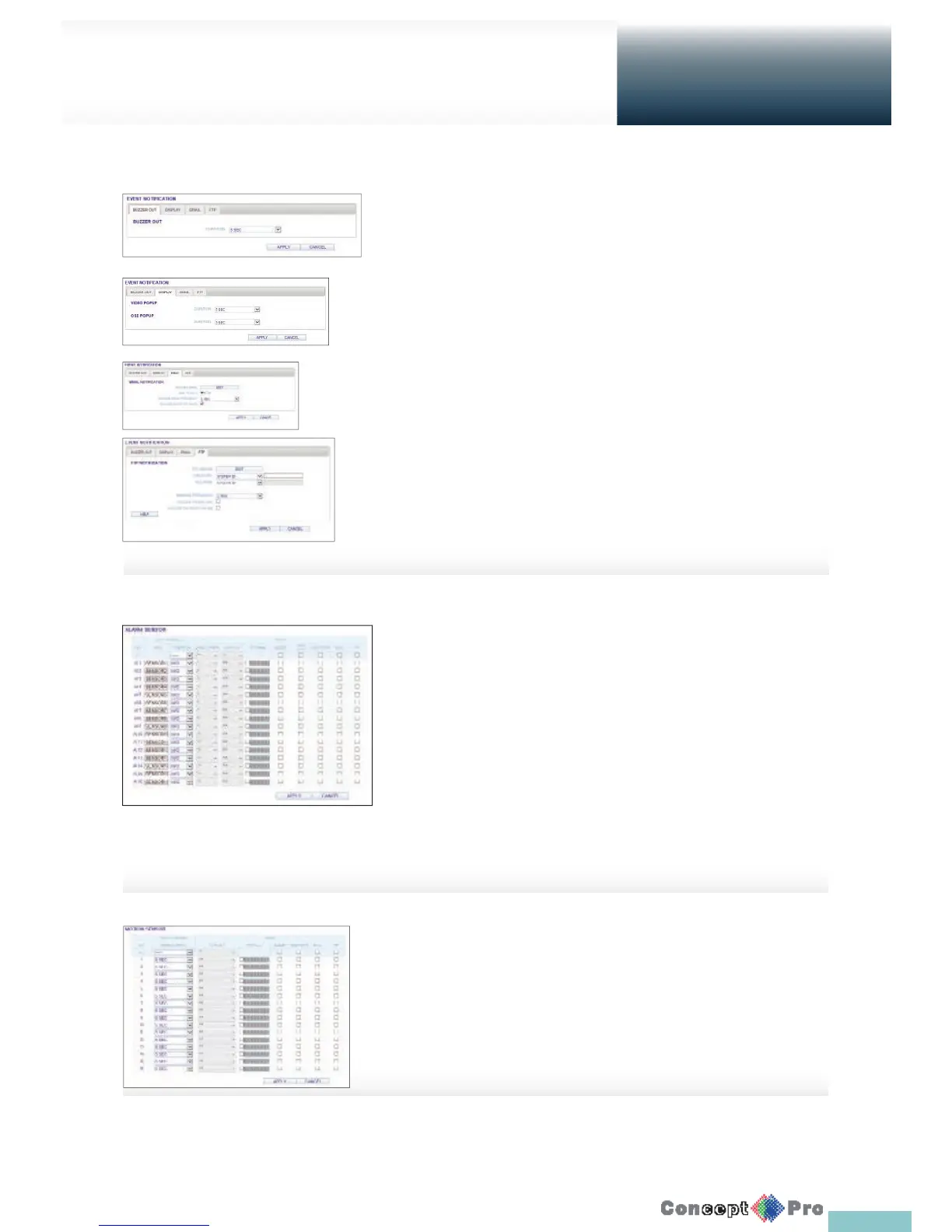 Specify the buzzer output time, video popup time, email noti cation and FTP