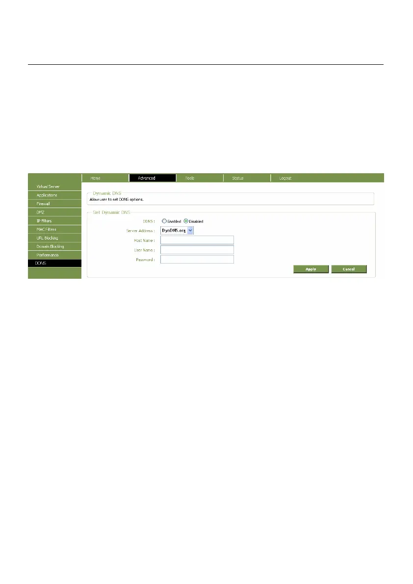 DDNS server. Enter the required DDNS information and click Apply to set this information in the
