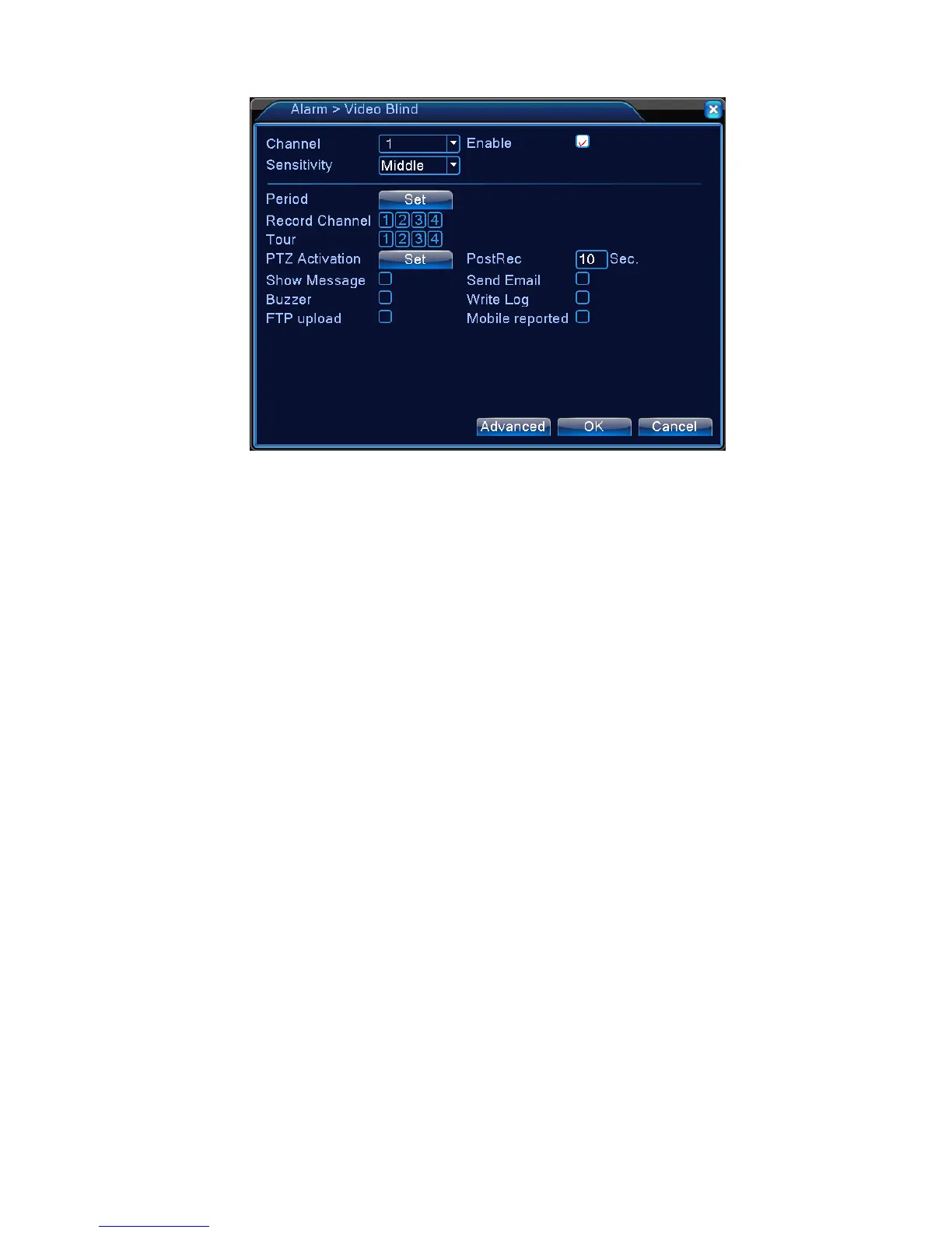 When the equipment can not obtain the channel video signal, the video loss alarm is turned on and