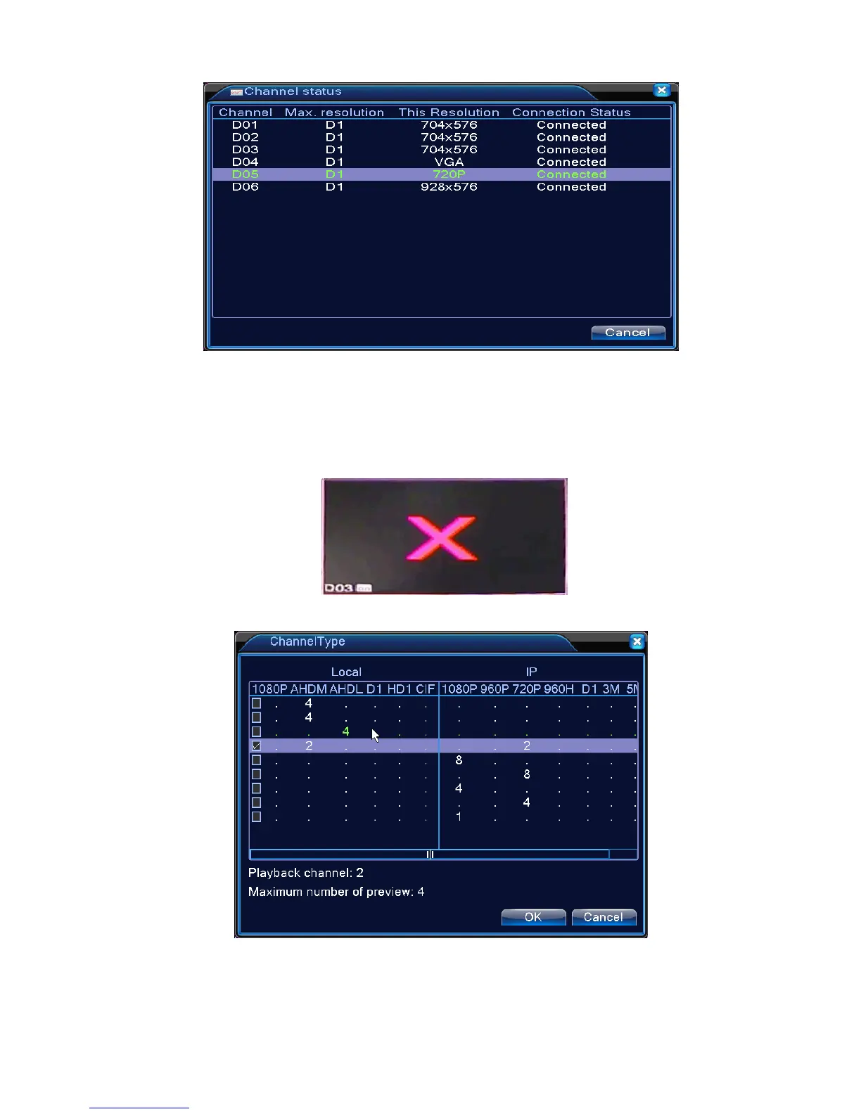 a red “X” will be shown on the preview image, for example: Under full digital channel mode, Max