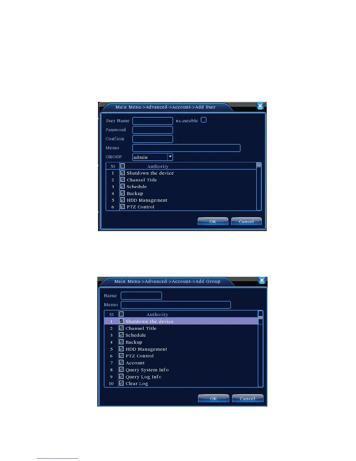 【Add Group】Add a user group and set the purview. There are 33 different purviews: shut down the
