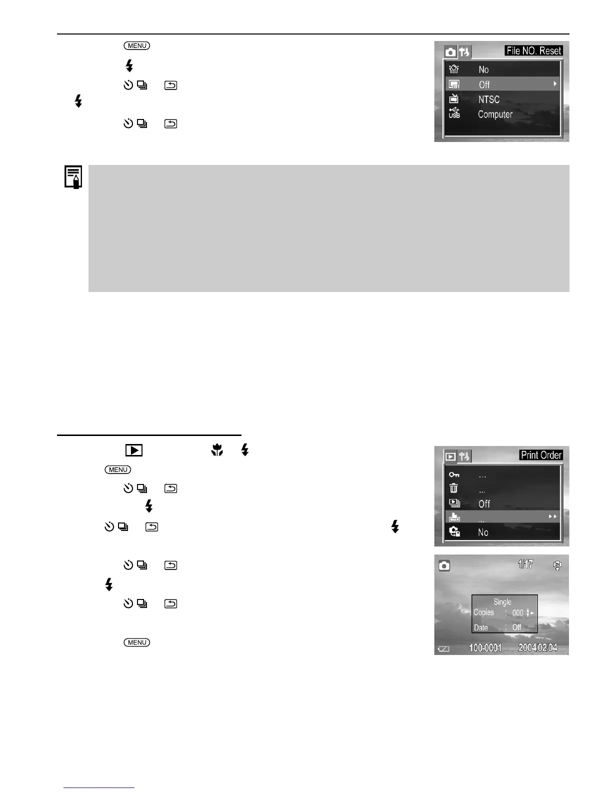 2. If the File No. Reset is set at ON position, when the memory card is formatted, the folder