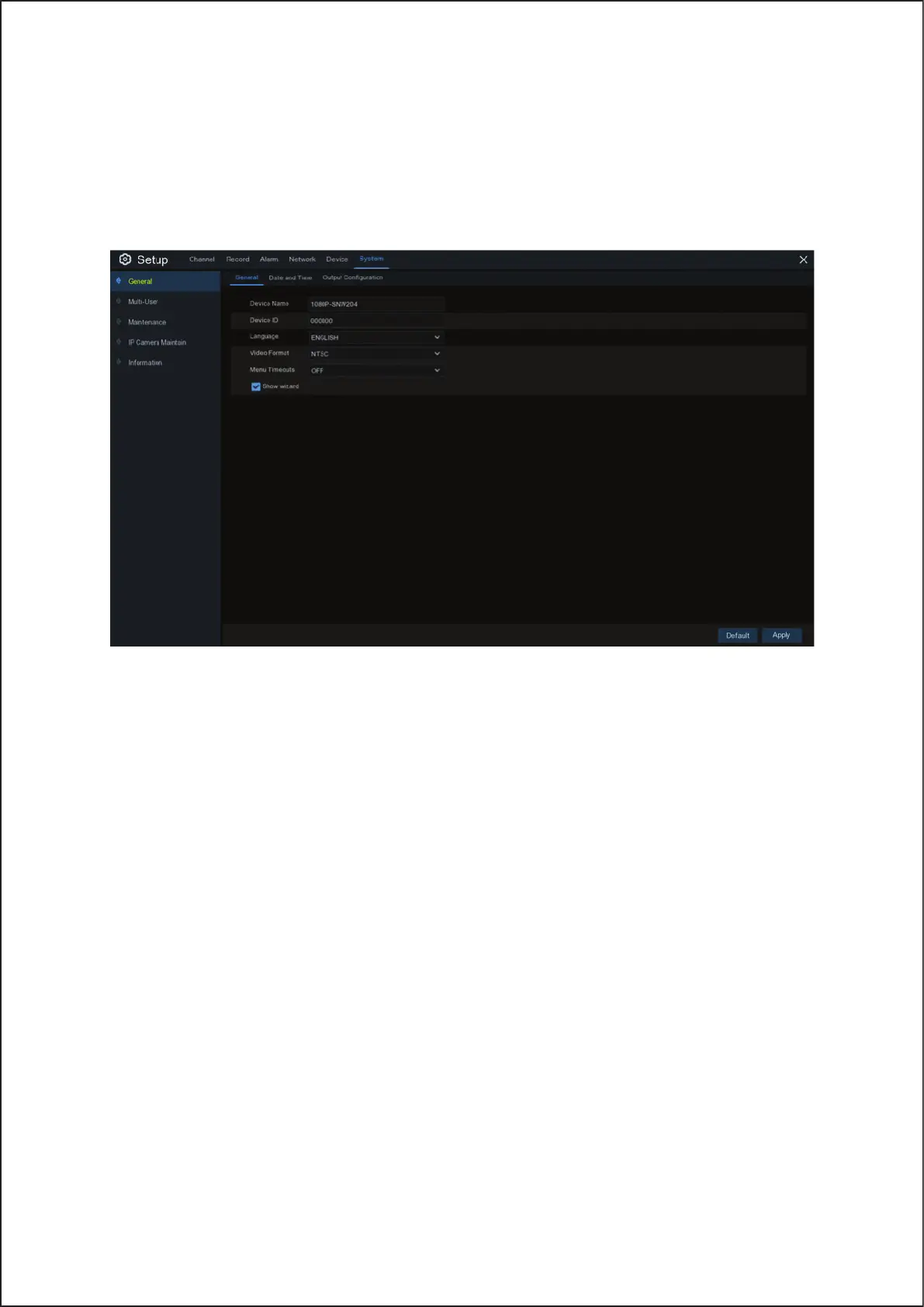 Menu Timeouts: Click the drop-down menu to select the time your Wireless NVR will exit the Main Menu when idle.