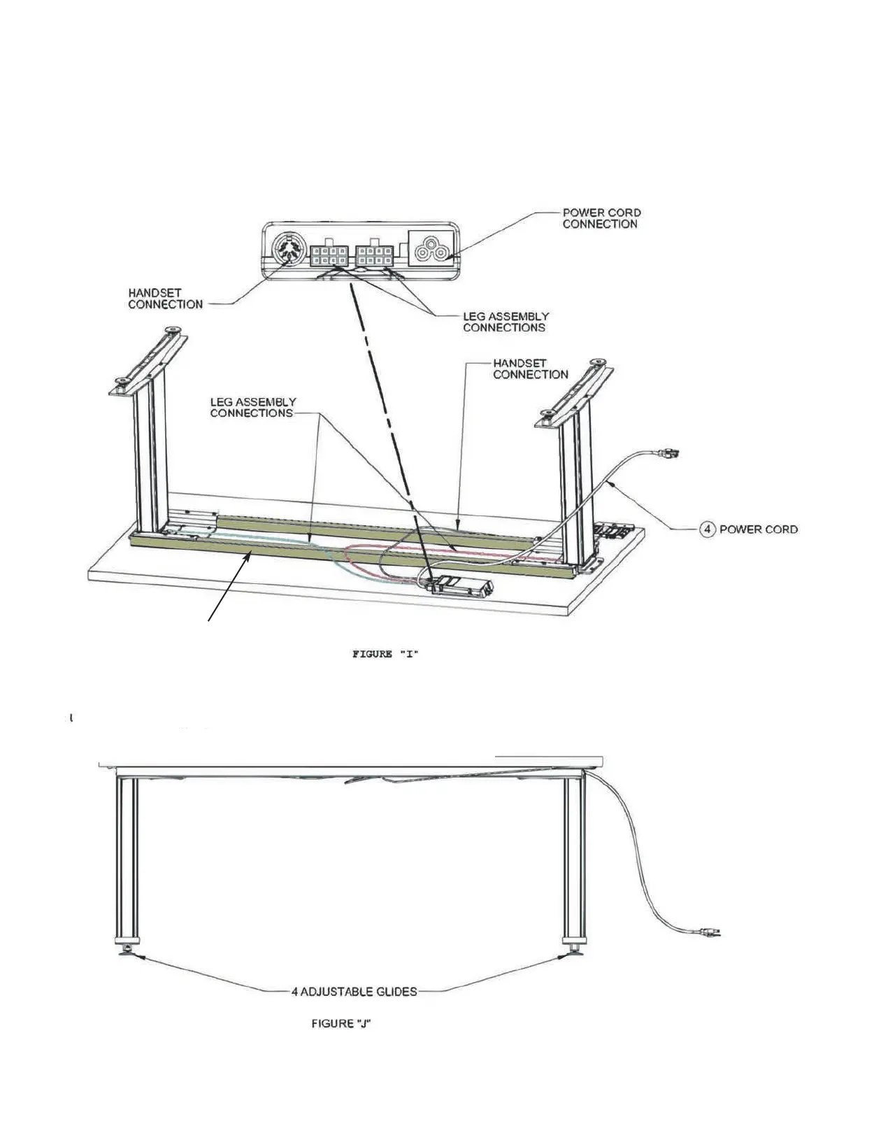 SET ARE CONNECTED TO CONTROL BOX. Connect handset cord and leg assembly cords, to the control box. See FIGURE "I".Use wire P-clip