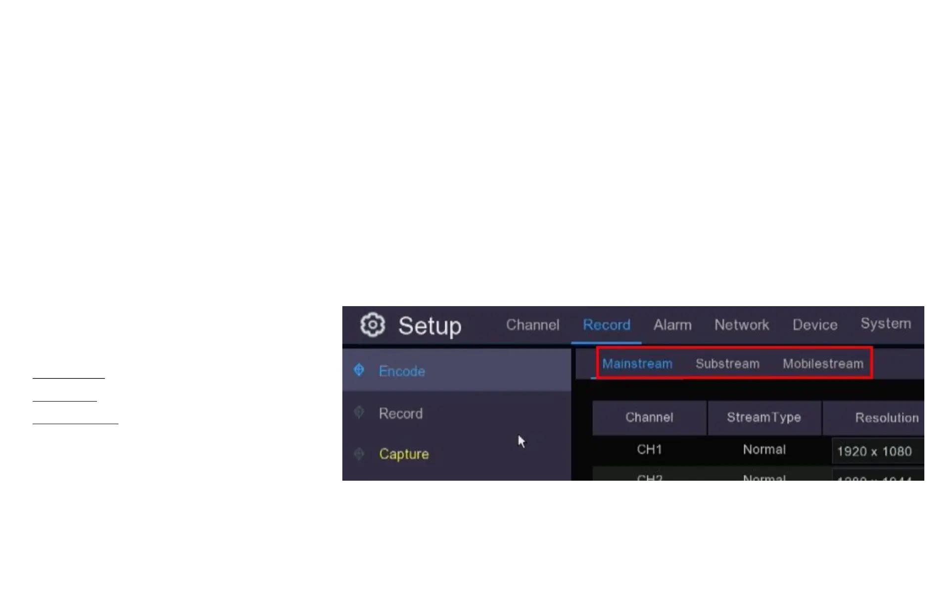 The first page you will see under the Record tab is the Encode page this is where you will make adjustments to the recording streams, recording