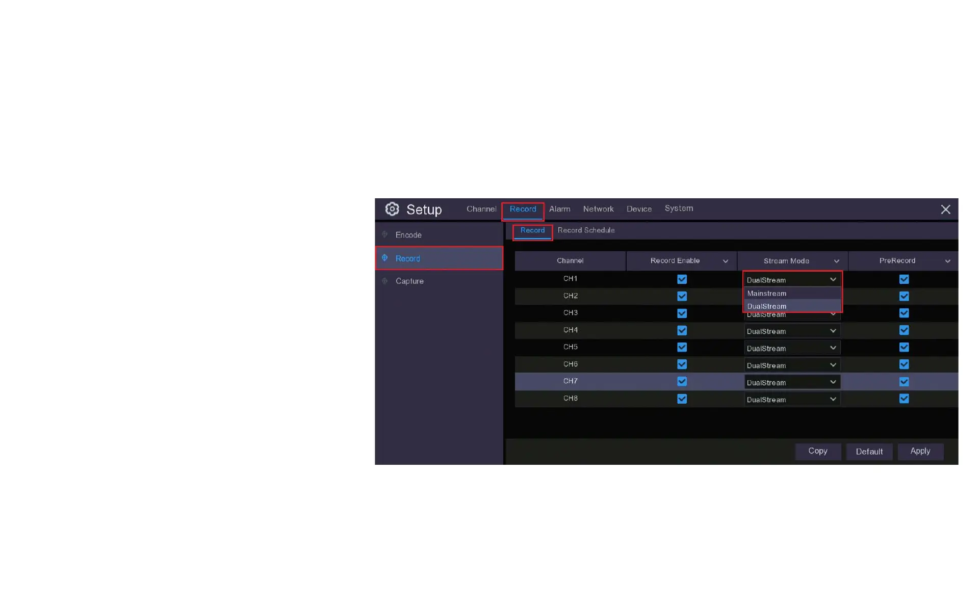 In this menu you can select the cameras you want recording, what their Stream Mode is and whether you want them to Pre-record.