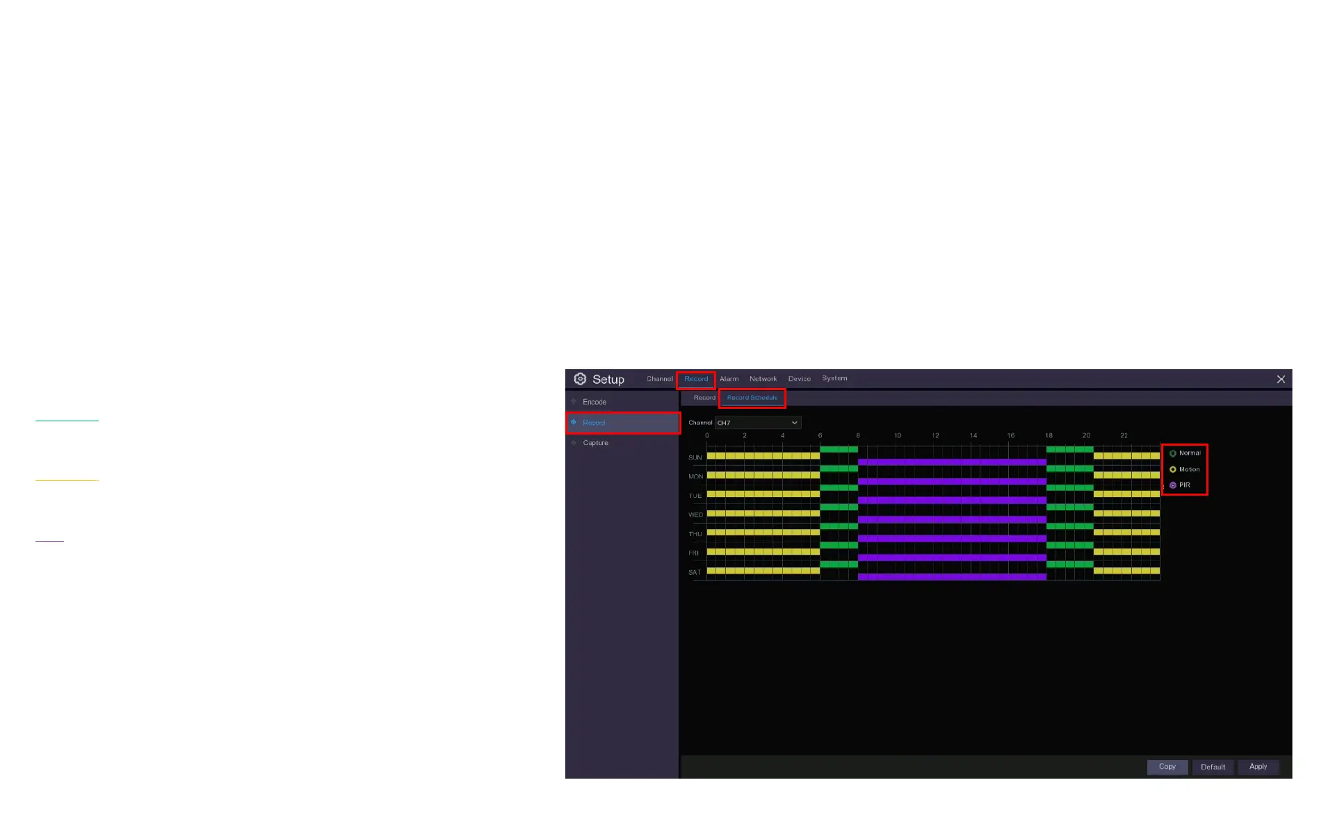hour blocks for each day, you can select which camera you want to schedule by using the Channel drop down menu at the top. The various