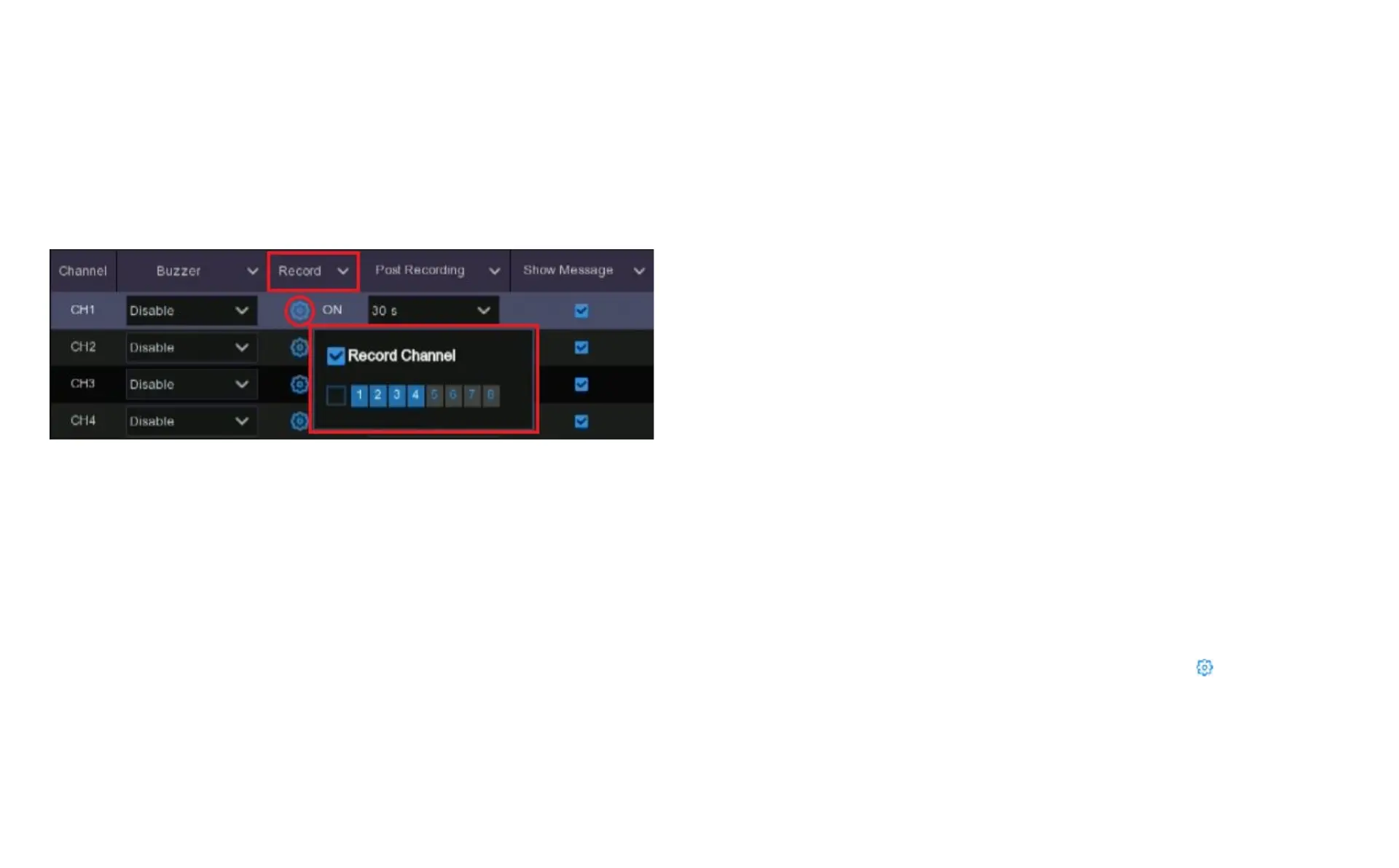 To set the other channels that will begin recording when an alarm is triggered on the channel you are setting up, click on the settings button under Record