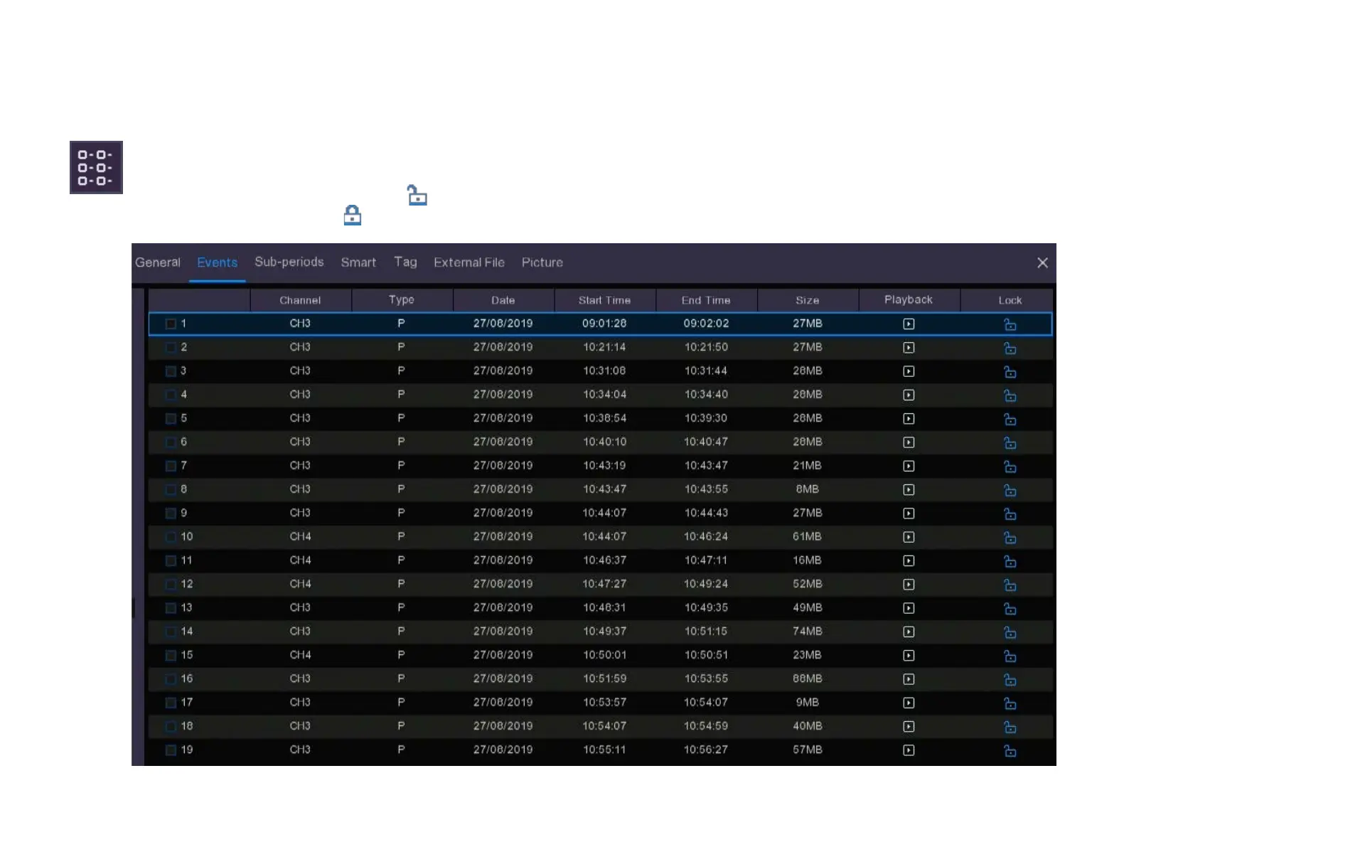 size and a playback button. In this view you can lock the video events to keep events from being