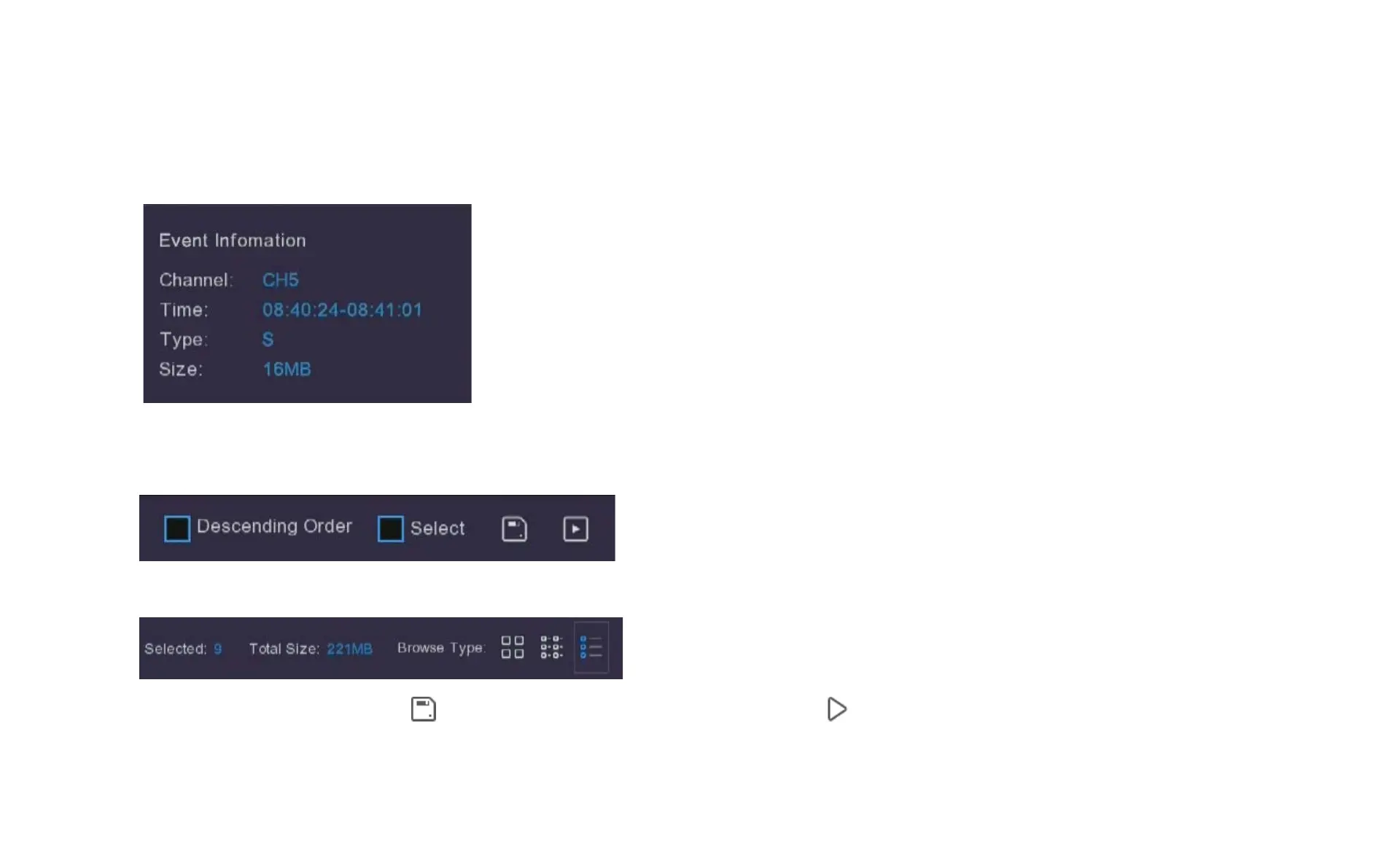 11. After selecting the file, click the icon to save the video to USB drive or click the icon to play the event in a separate playback