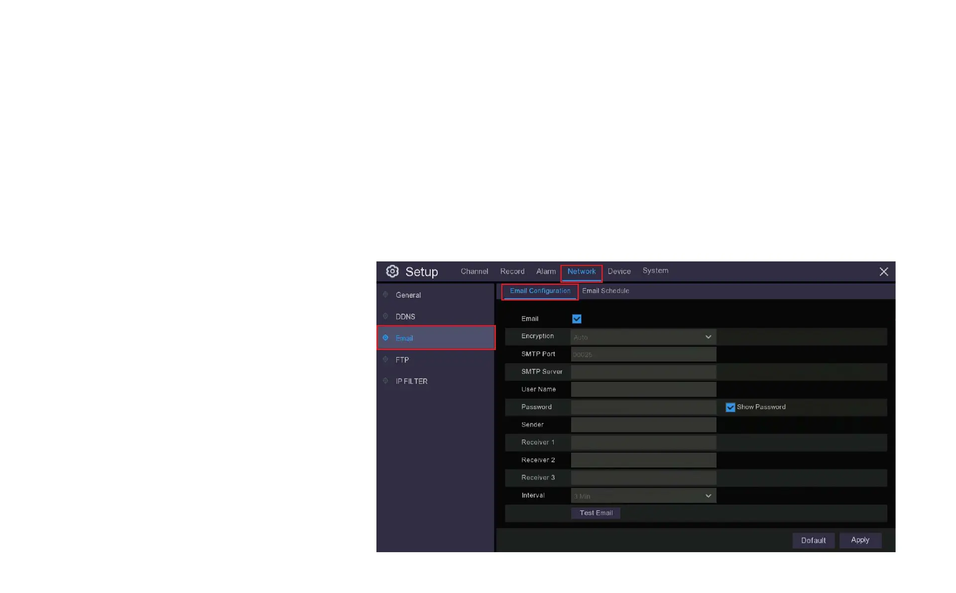 To use the email notification you need to set up your device with an email account to use when sending alerts, this can be any email address you
