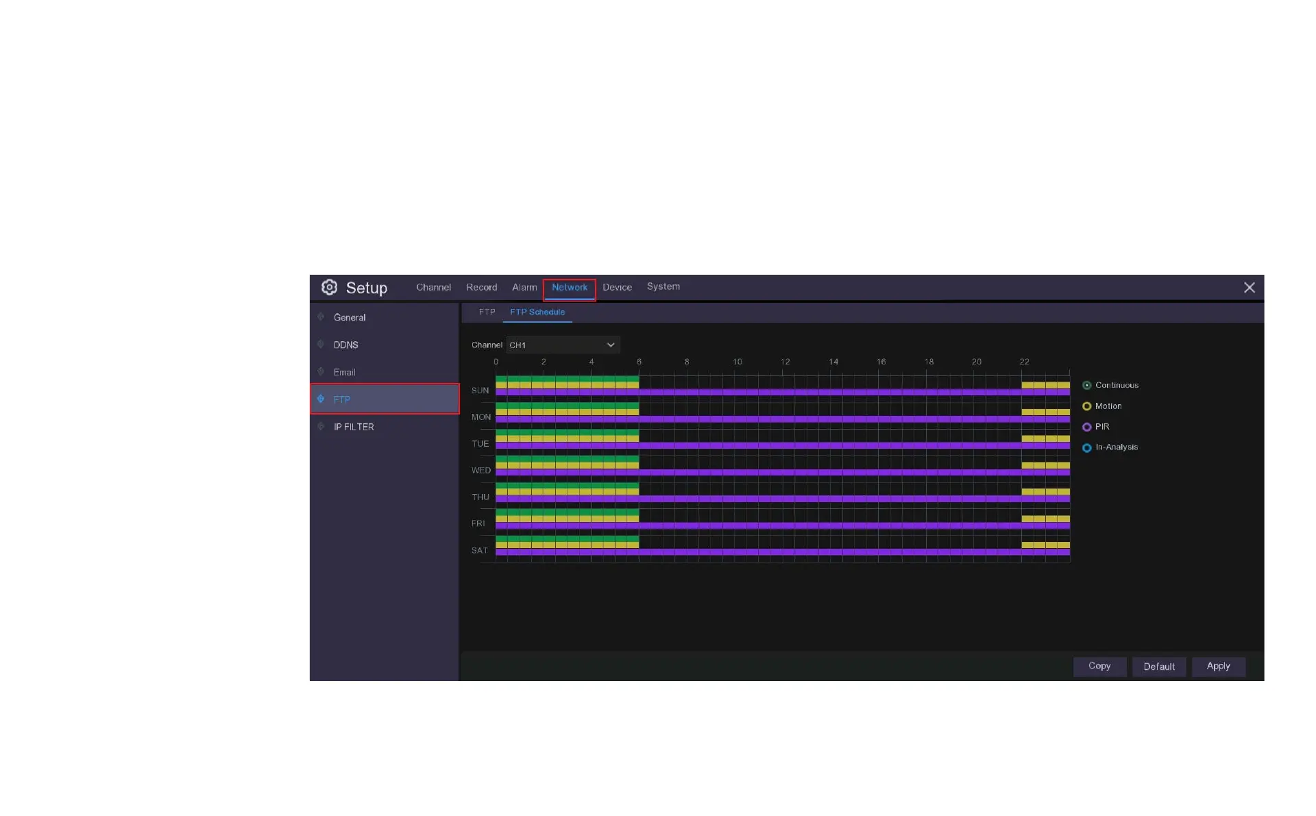You need to configure the schedule to fully implement the FTP uploads. The various recording triggers are shown as color coded rings on the right hand side of