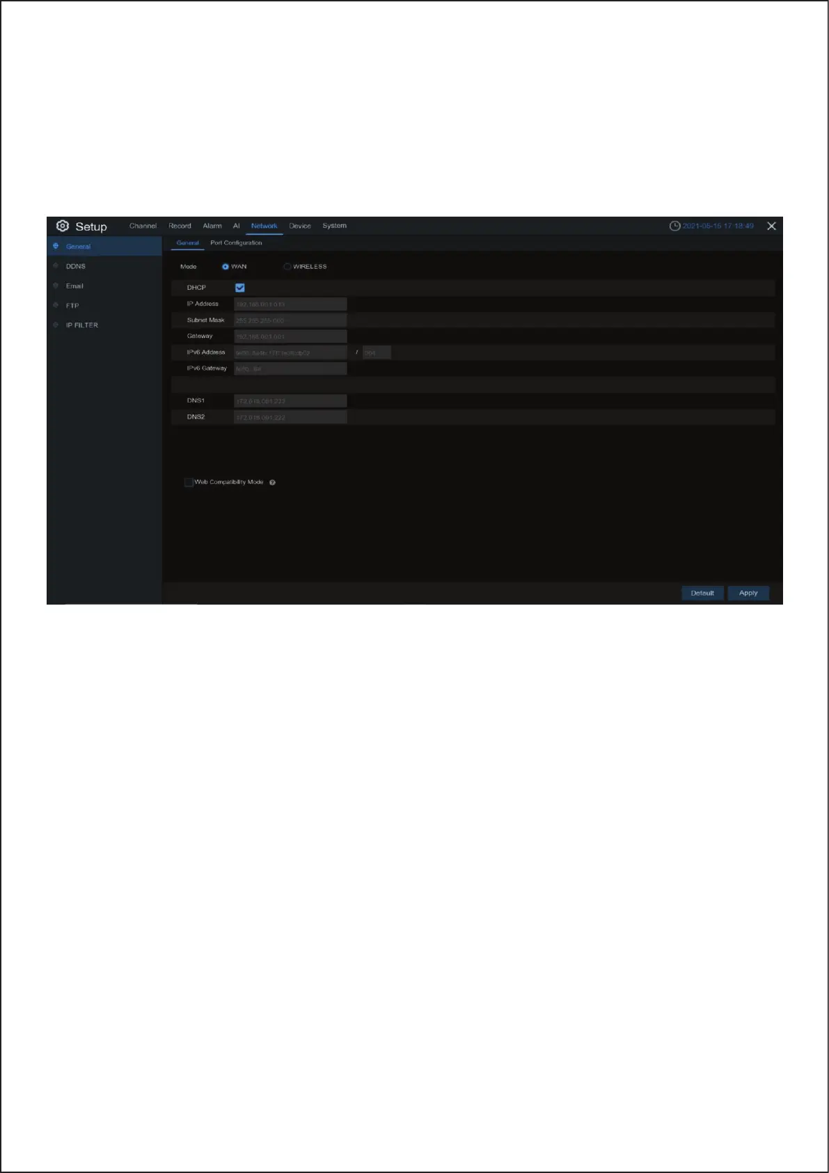 IPv6 Address: The IPv6 address identifies the WIRELESS NVR in the network. It consists of eight