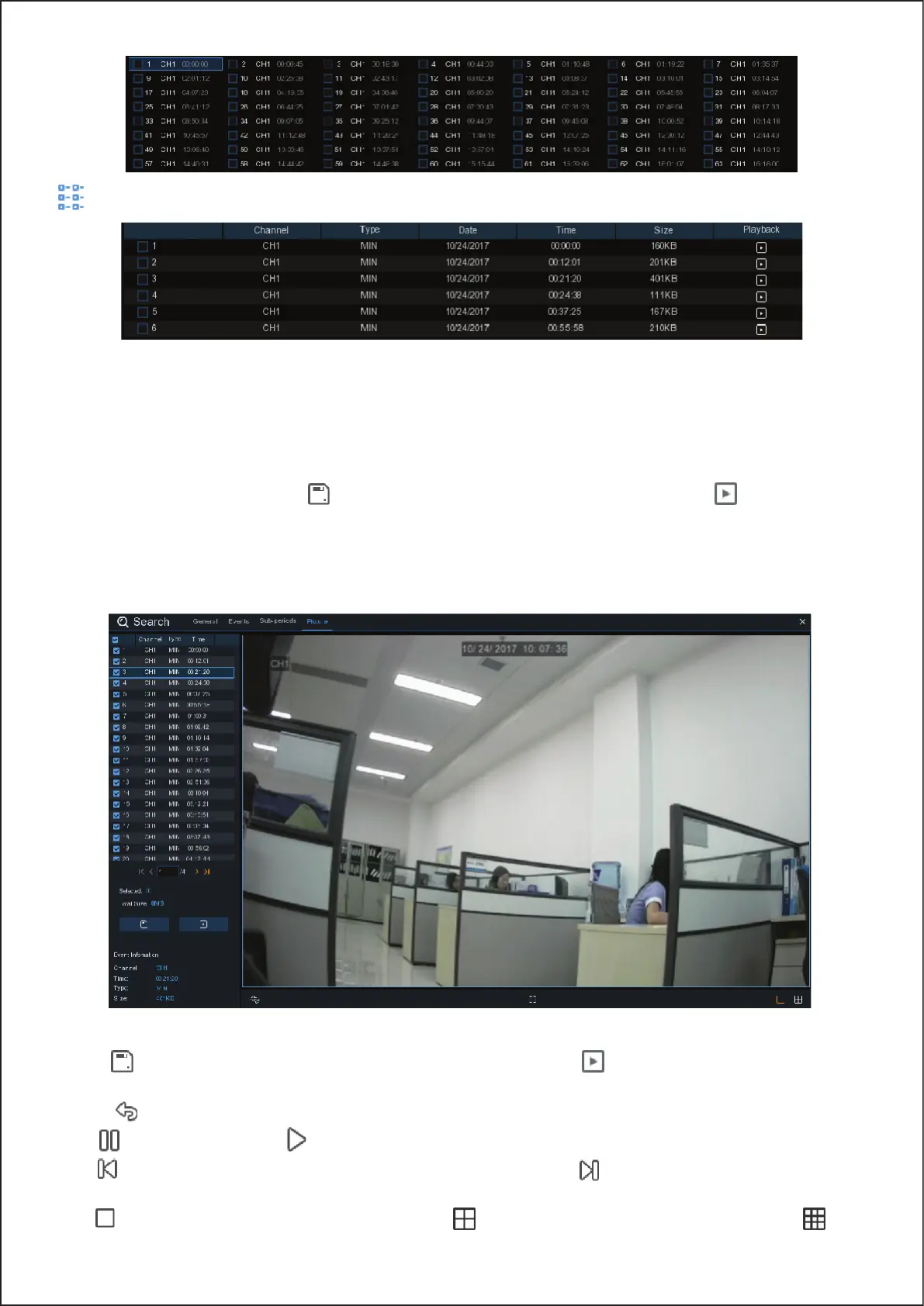 Click button to view a single snapshot at a time, click button to view four snapshots at a time, press