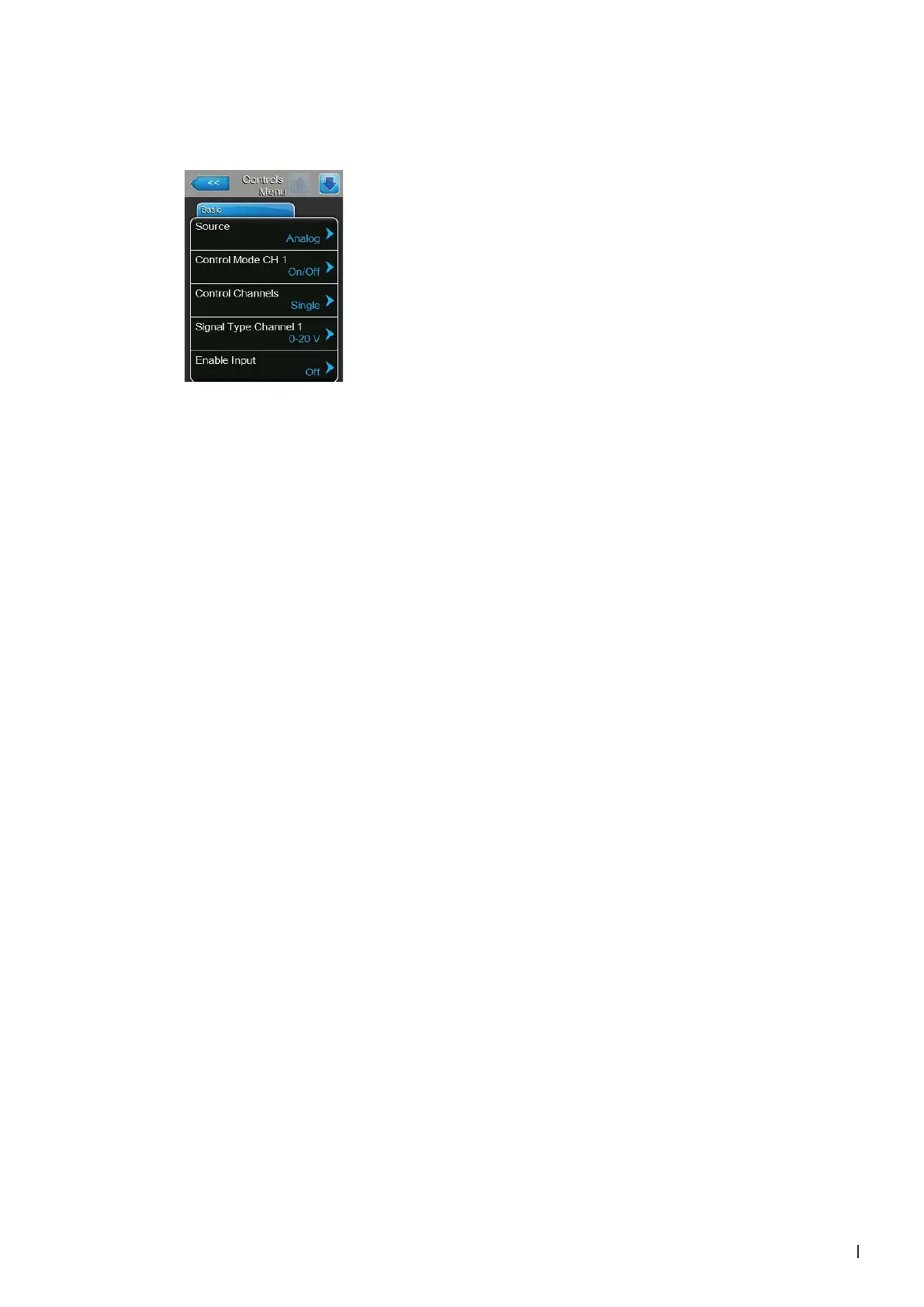 parameters "Source" to "Analog", "Control Mode CH 1" to "On/Off" and "Control Channels" to