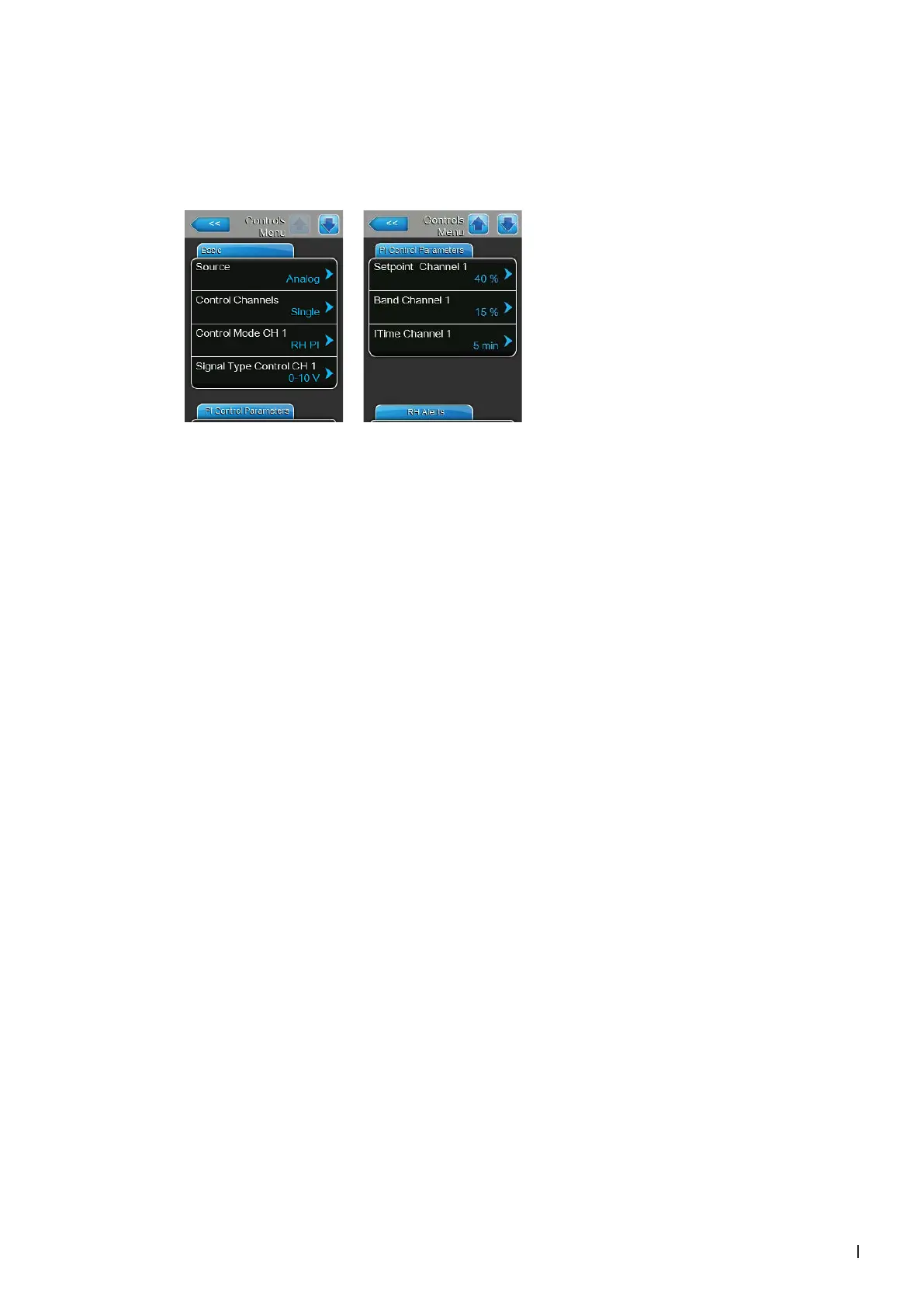 "Source" to "Analog", "Control Mode CH 1" to "RH PI", "Signal Type Control CH 1" to "0-10V" (or