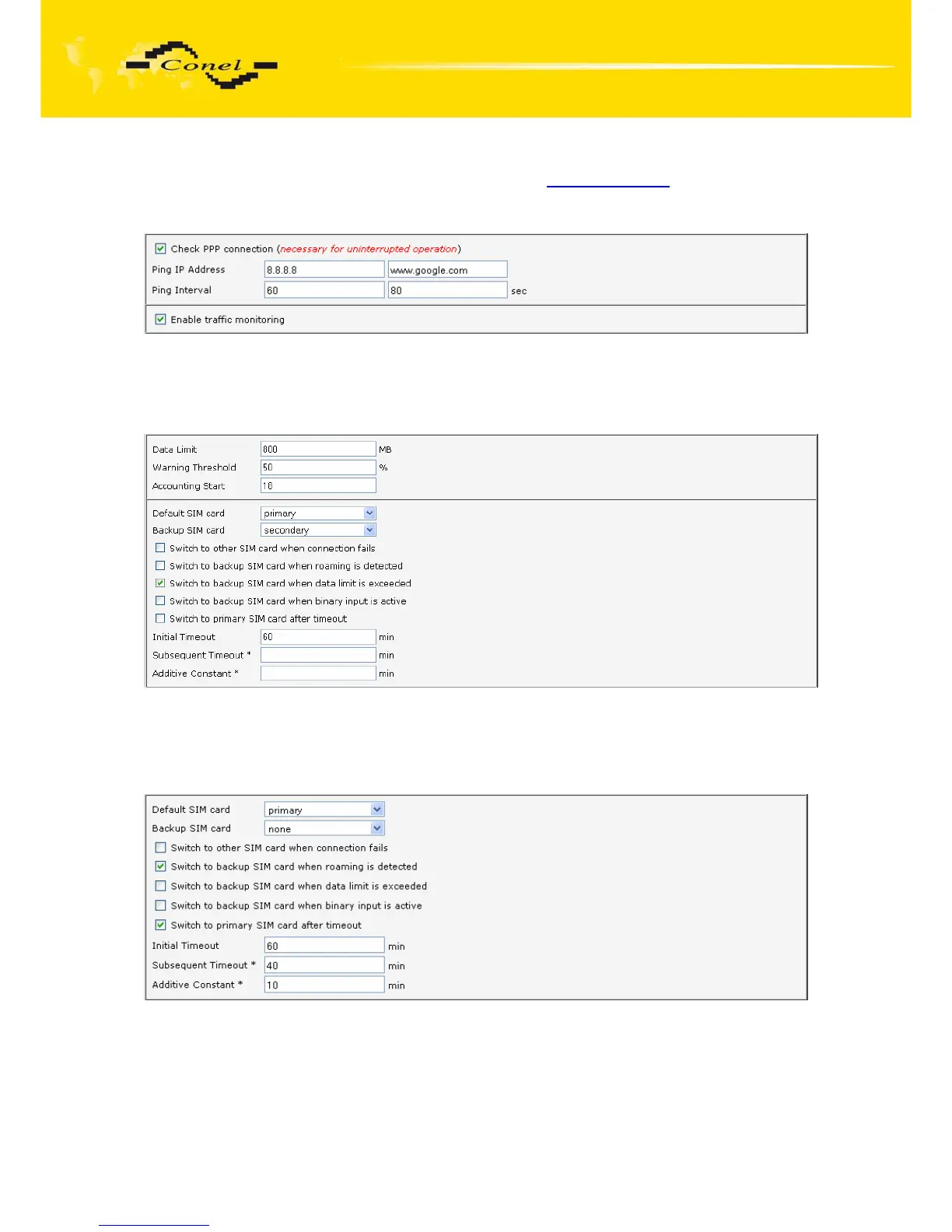 interval of 60s for primary SIM card and to the address www.google.com