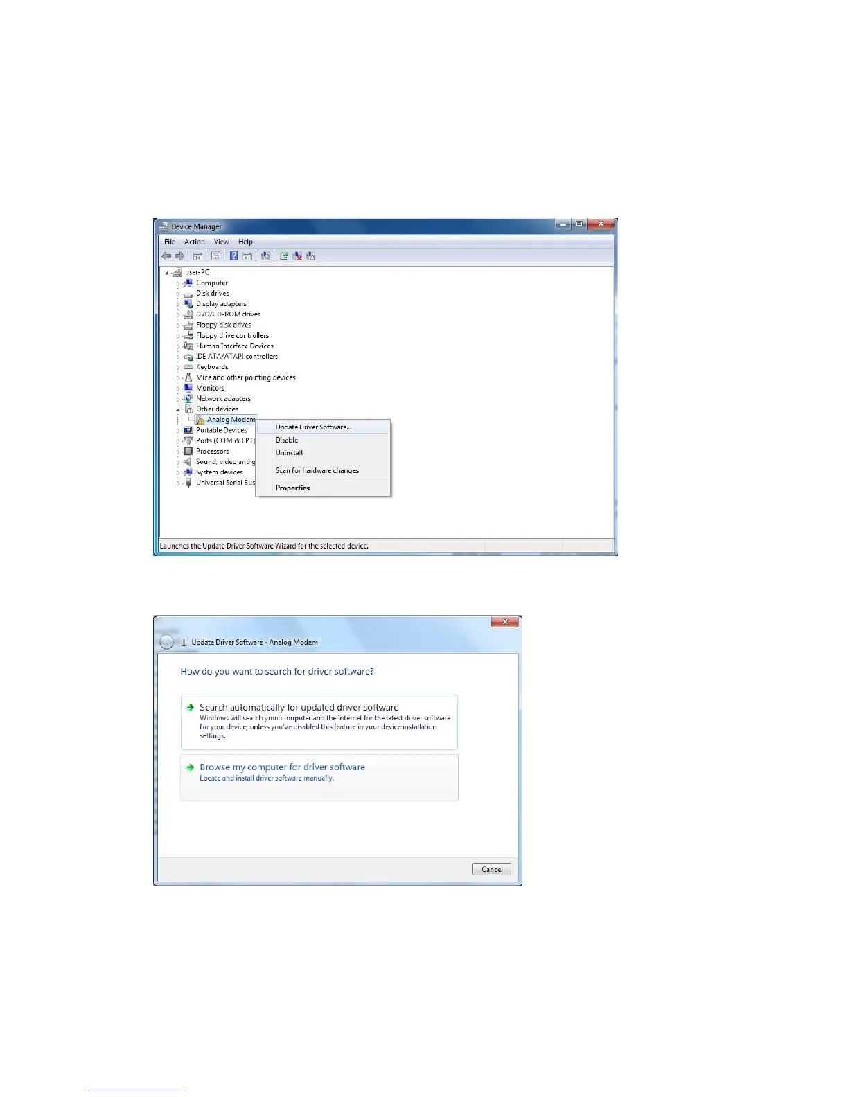 2. The Device Manager will show a unknown device, such as Analog Modem. Move your mouse on this unknown