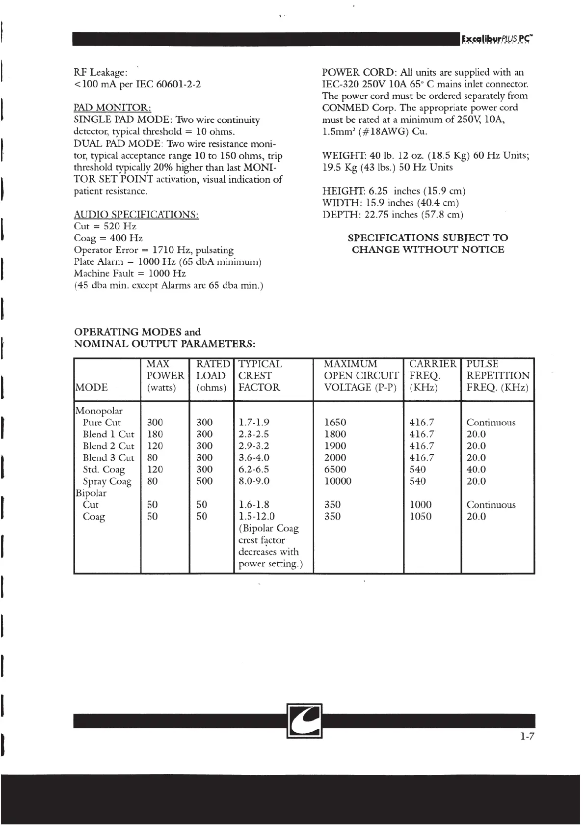ConMed ExcaliburPLUS PC - Detailed Performance Specifications