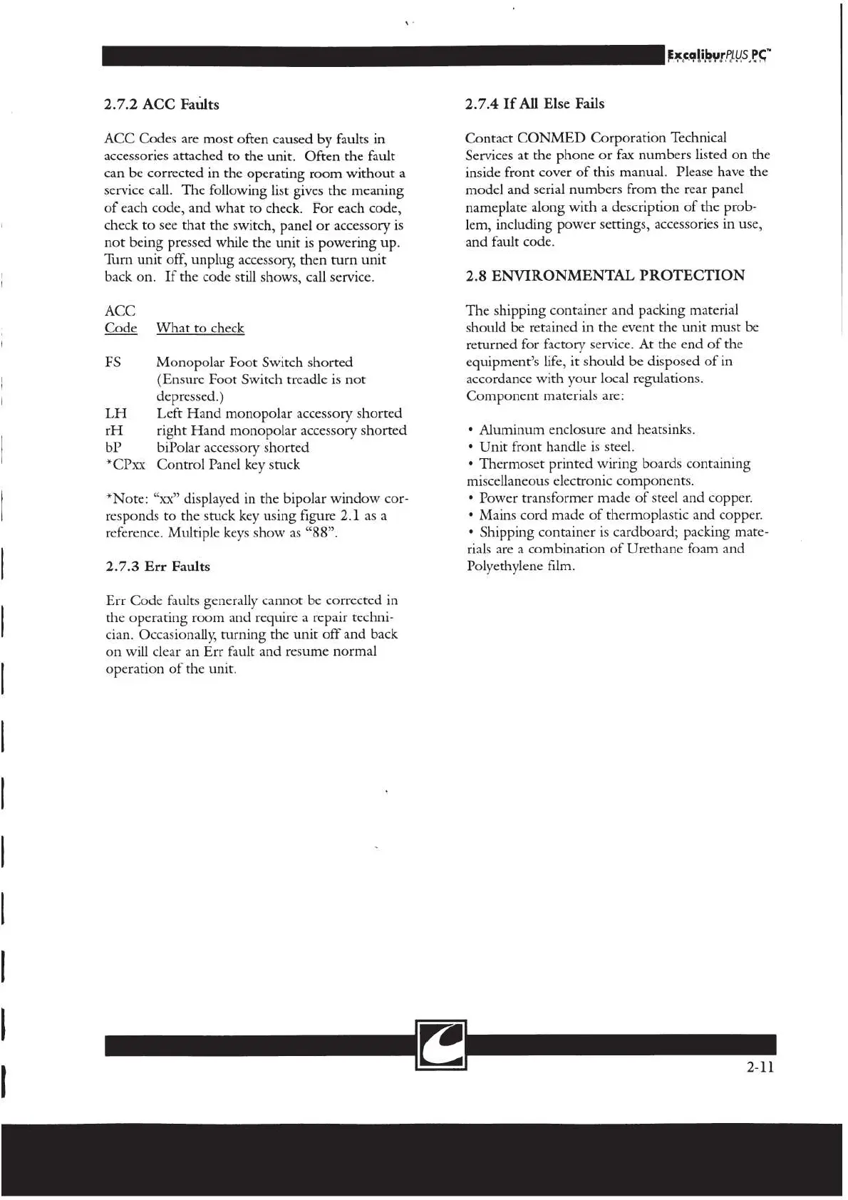 ConMed ExcaliburPLUS PC - ACC and ERR Fault Code Information; Environmental Protection Guidelines