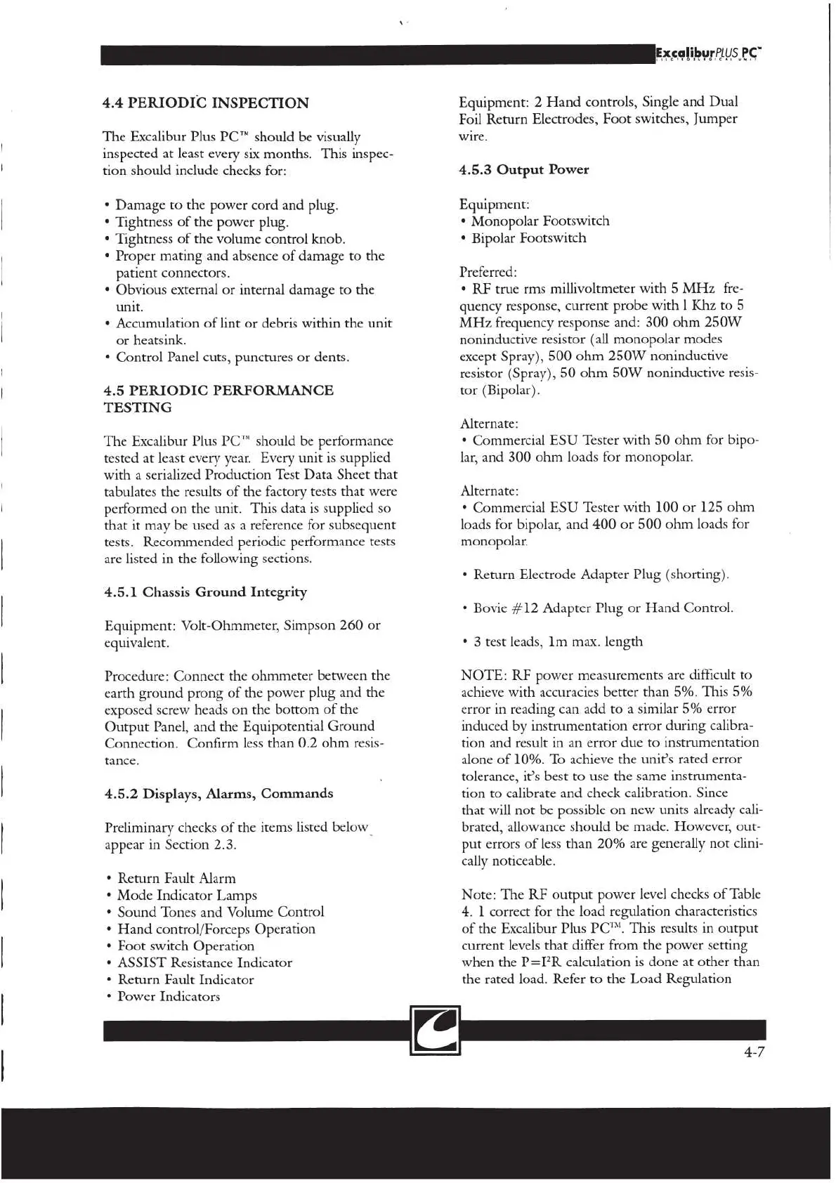ConMed ExcaliburPLUS PC - Periodic Performance Testing; Electrical Safety and Output Tests
