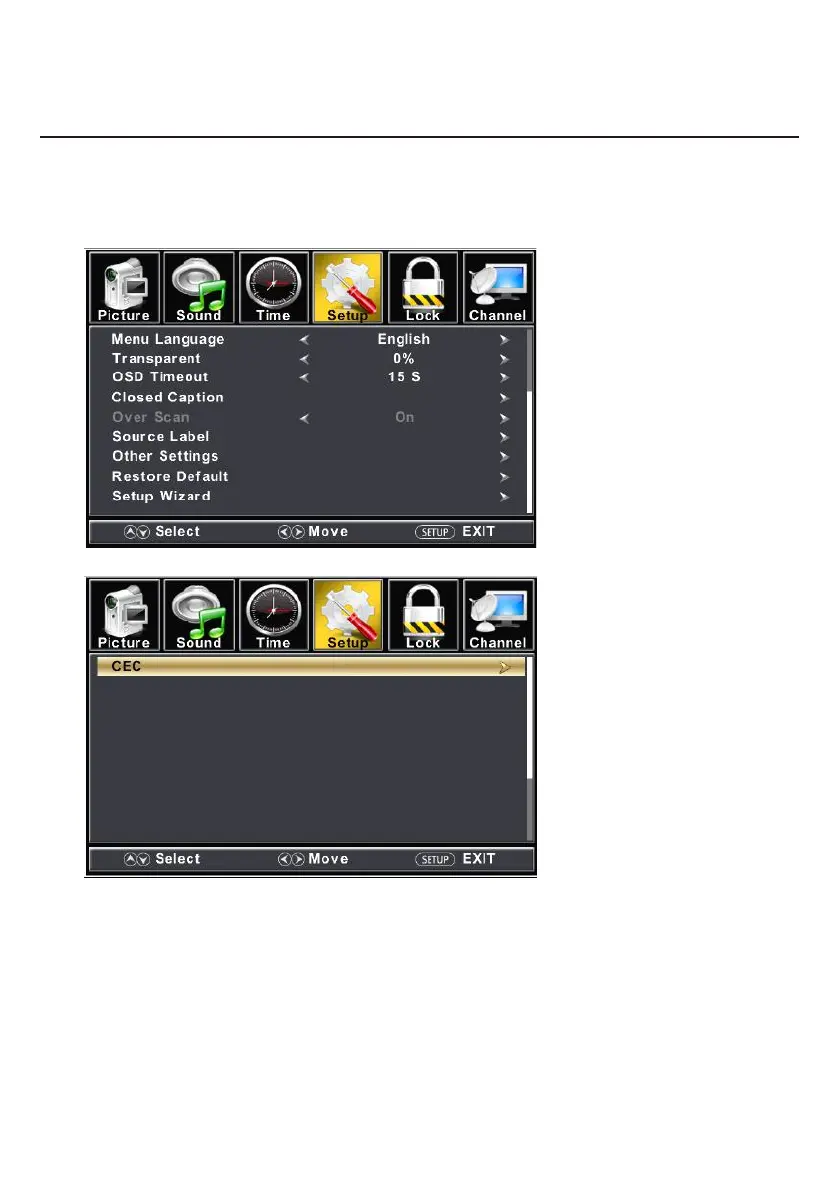 Press ▼ / ▲ button to select among Menu Language / Transparent / OSD Timeout / Closed Caption /Over Scan/ Input Label /