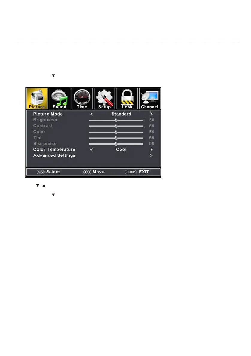 button to select among Picture Mode /Brightness/ Contrast / Color / Tint / Sharpness / Color Temperature/ Press