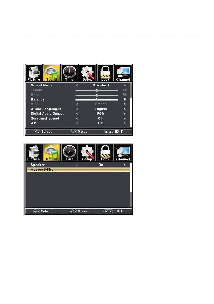 Press ▼ / ▲ button to select among Sound Mode/Treble / Bass / Balance /MTS/ Audio Language /Digital Audio Output/